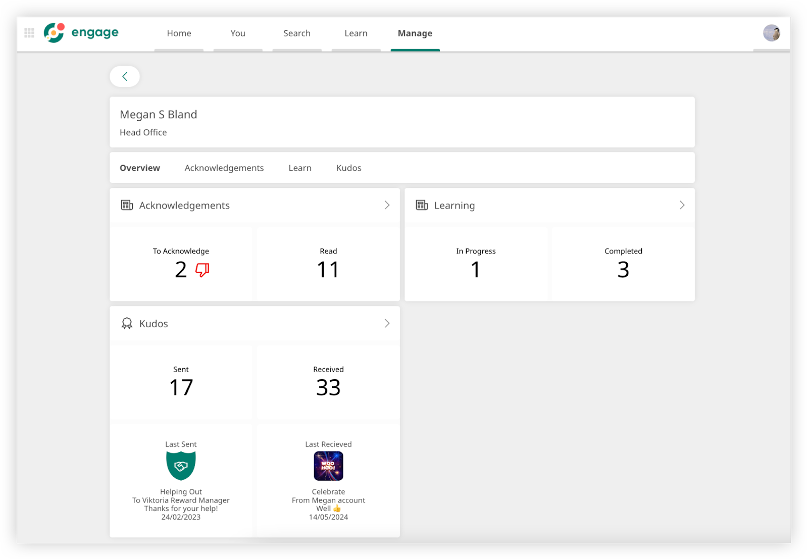 We’ve introduced a new user engagement area, accessible through the Manage page on the web. This feature provides insights into how your employees are interacting with Ocasta Engage. By selecting a specific user, you can view detailed statistics on acknowledgements read, courses in progress and completed, and kudos sent and received.