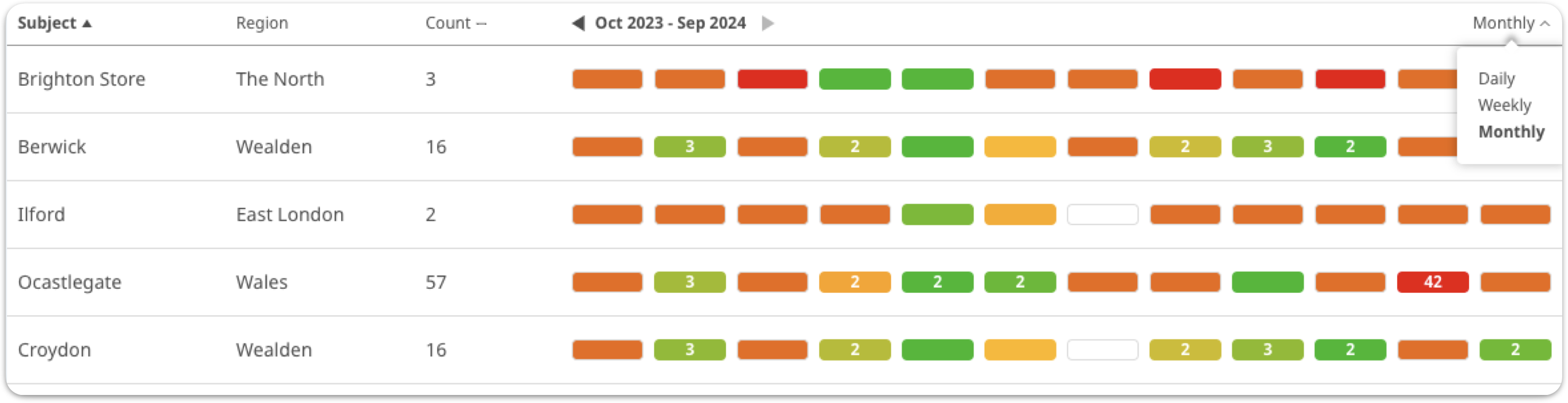 In response to user feedback, we've updated the Timeline report to support different review frequencies. Previously, the report displayed daily data one month at a time, which worked well for daily or weekly reviews. However, for longer-term reviews, such as quarterly or yearly, we've added a filter that allows you to choose between the following options: