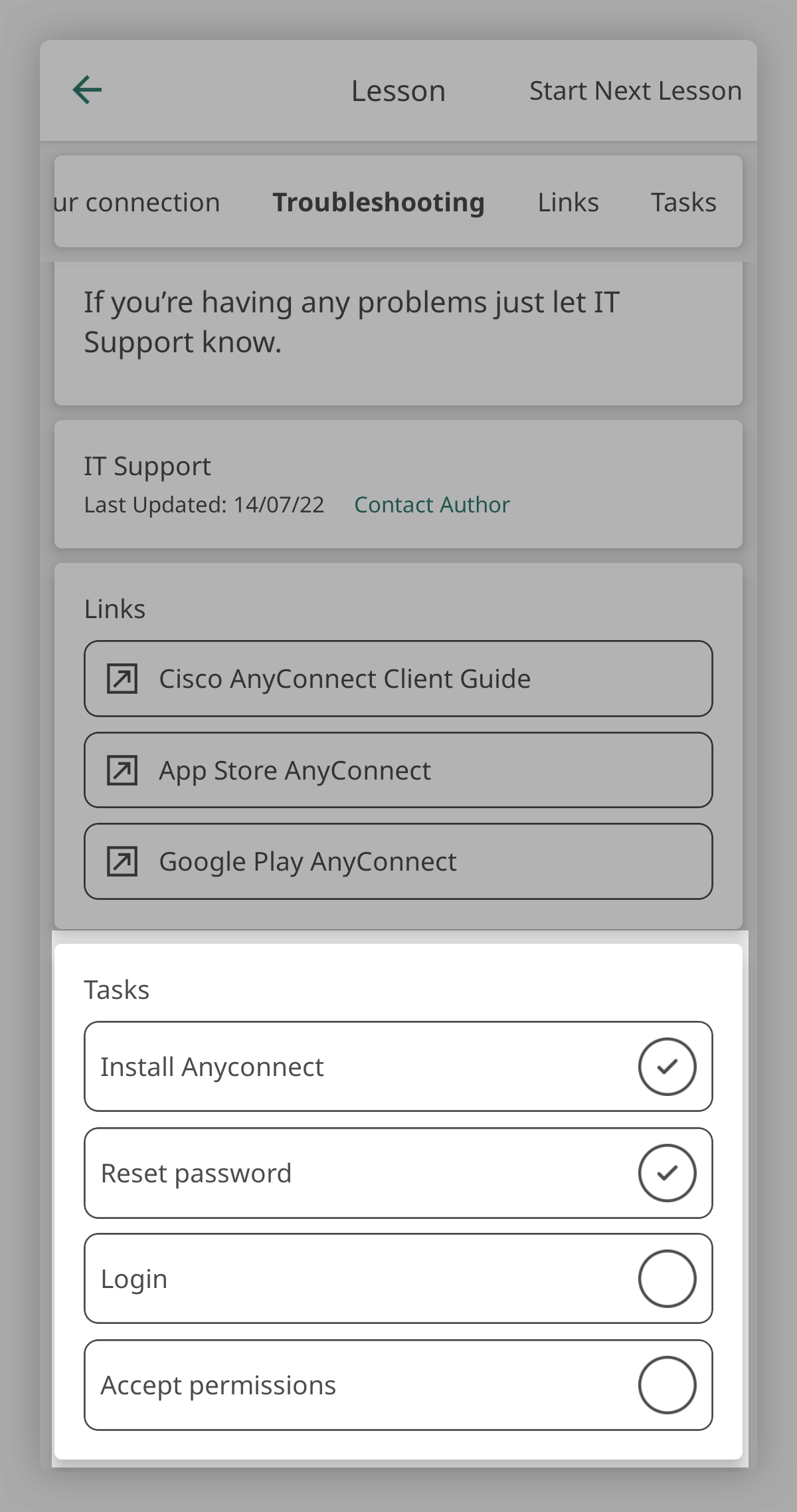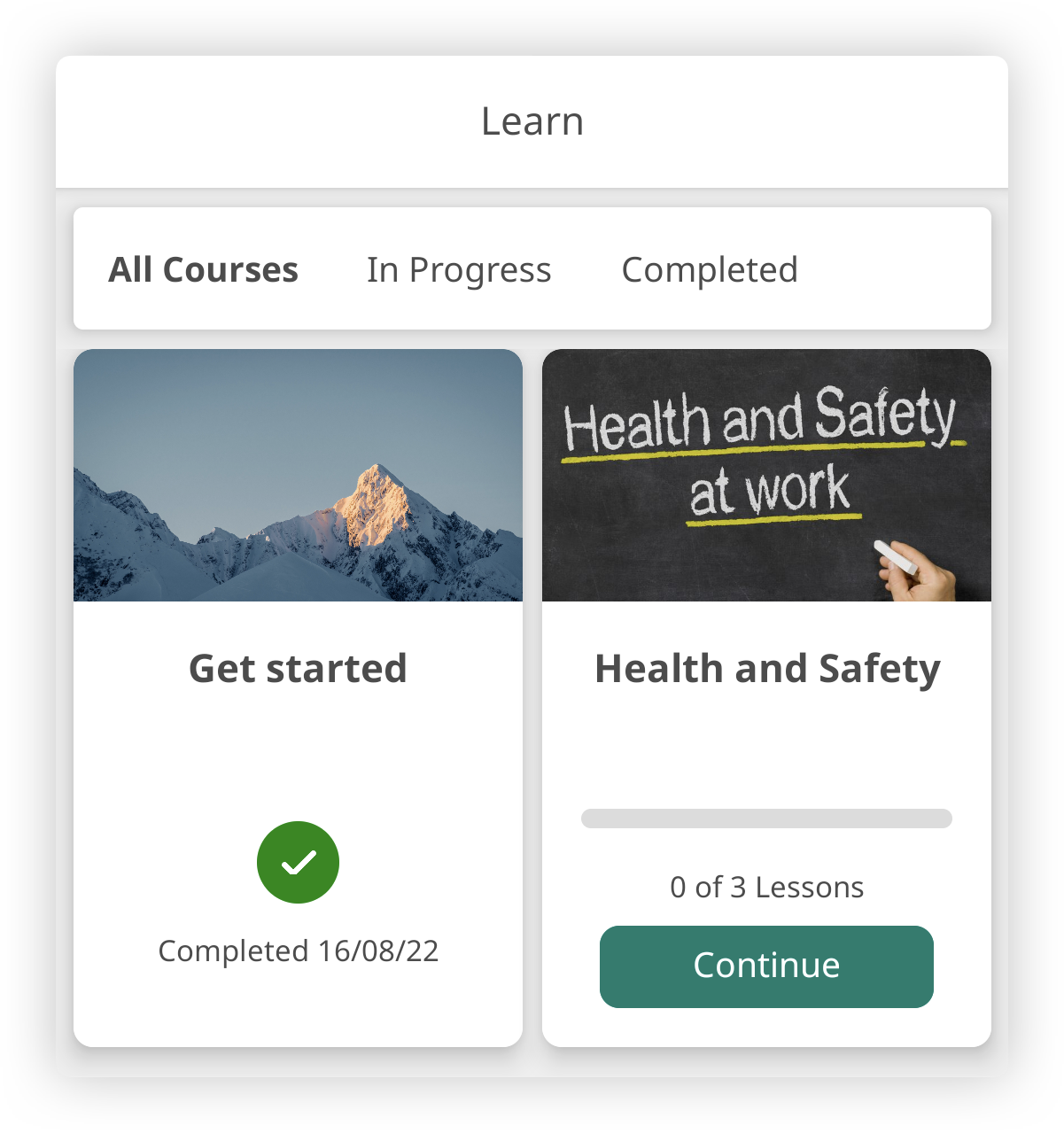 Courses are accessed from the 'Learn' section on Engage and you can also see your learn activity on the 'You' section. Admins can create and manage these playlists on the web. Questions and tasks can be added to articles in the Admin.