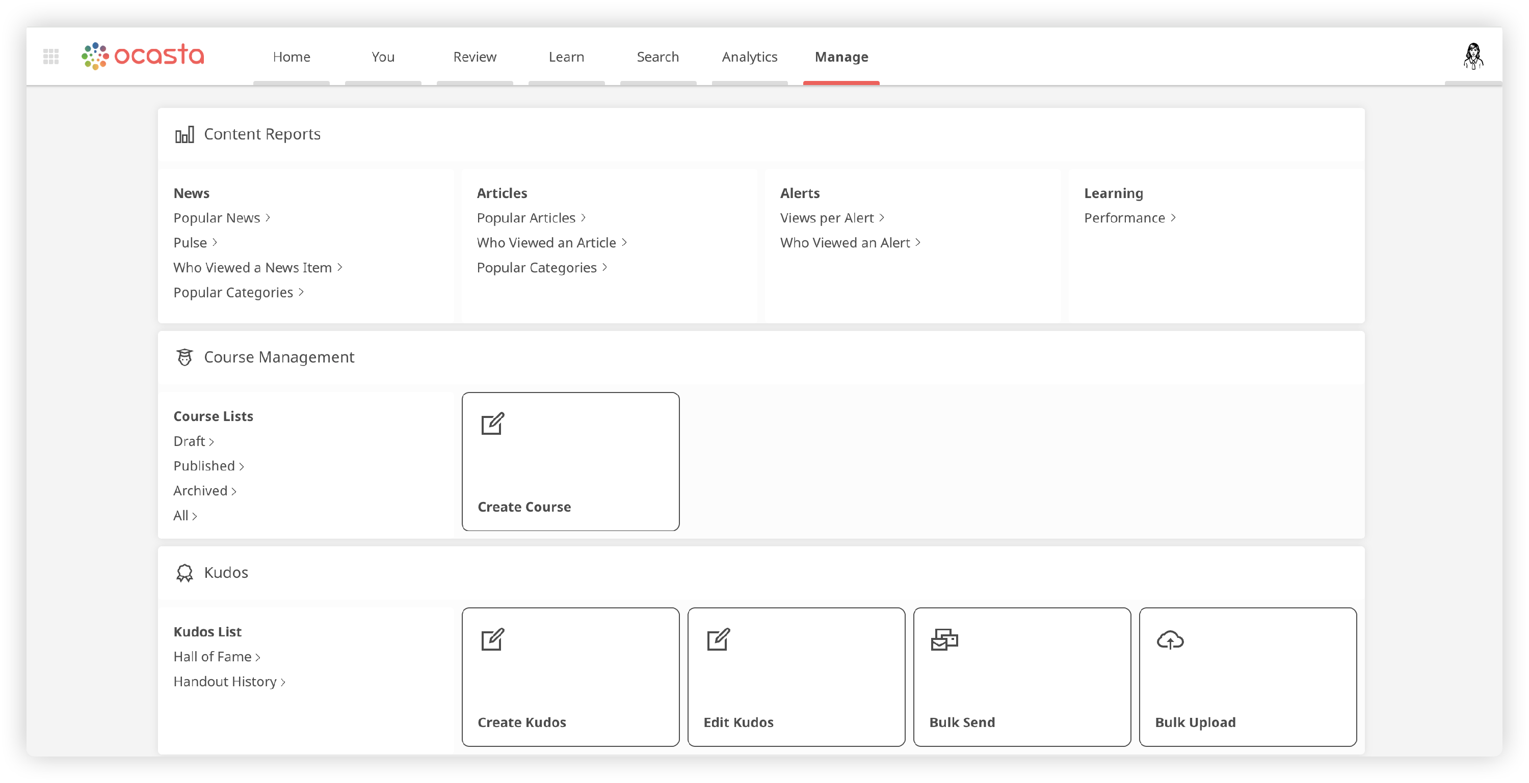 Courses are accessed from the 'Learn' section on Ocasta and you can also see your learn activity on the 'You' section. Admins can create and manage these playlists on the web. Questions and tasks can be added to articles in the Admin.