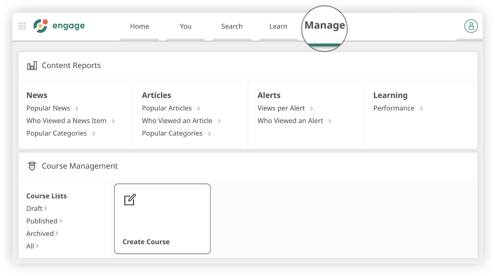 1. If you are an Admin user you will see the 'Manage' section on the top nav bar on the web.