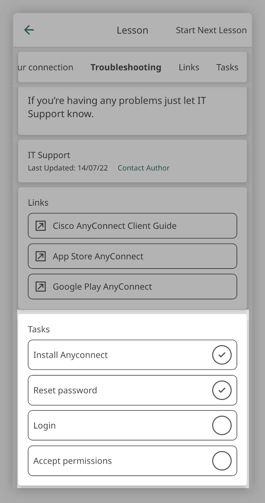 Learning is all focused around the idea of microlearning, so your staff can learn in short bursts quickly and easily. You can add tasks or questions to articles and you can group articles into courses. For example, you may want to create a course for new starters which contains all the articles they need to work through.