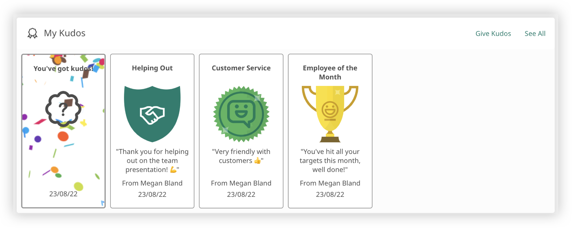 In the admin you can also choose to show the Kudos component on the 'Home' page on Engage. If you have received a new Kudos which is unopened this will display. If you have no unopened Kudos then you'll be able to see the most recent kudos handed out within your organisation.