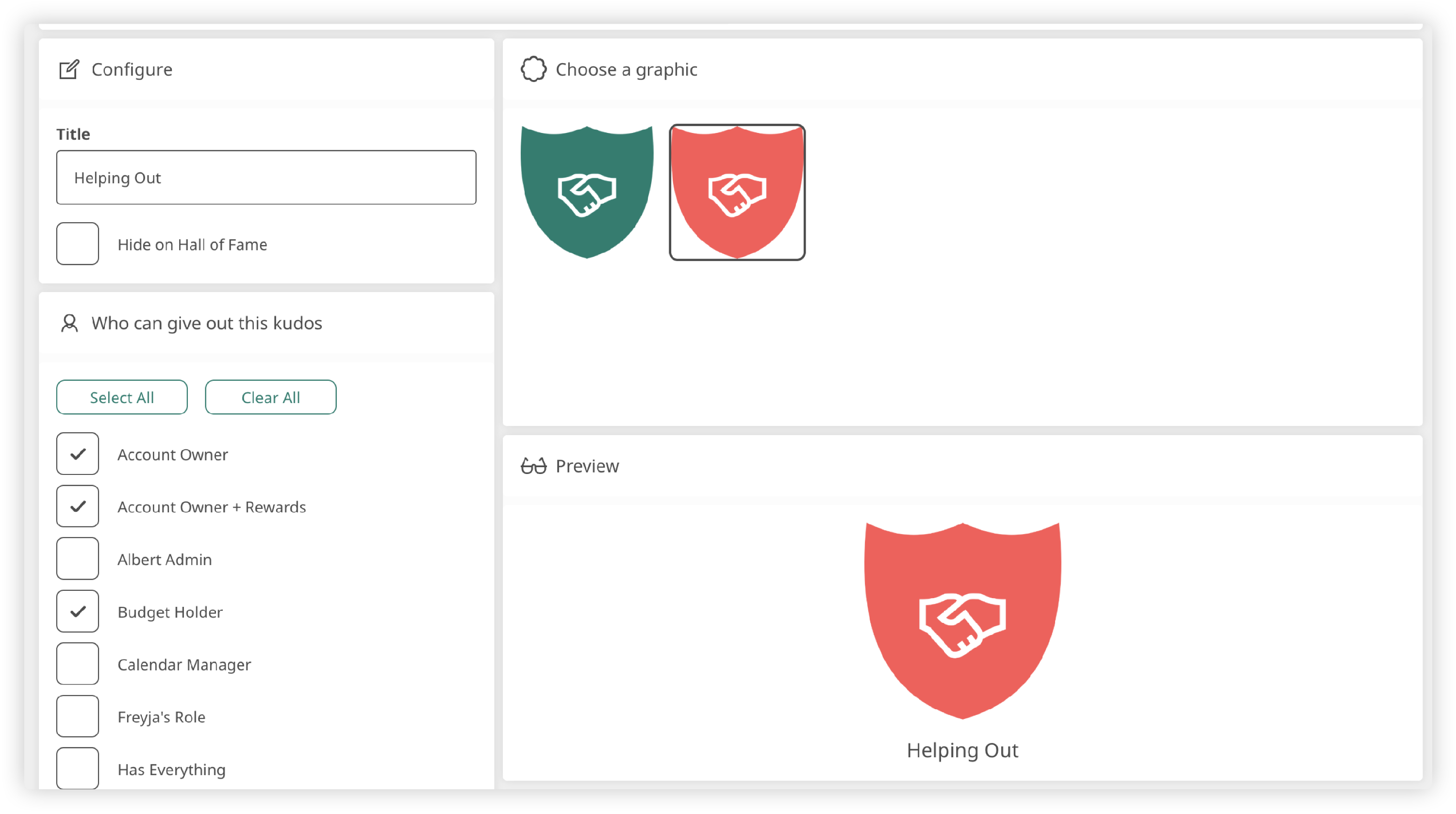 Select which roles can give out the Kudos. Select all roles or specific roles.