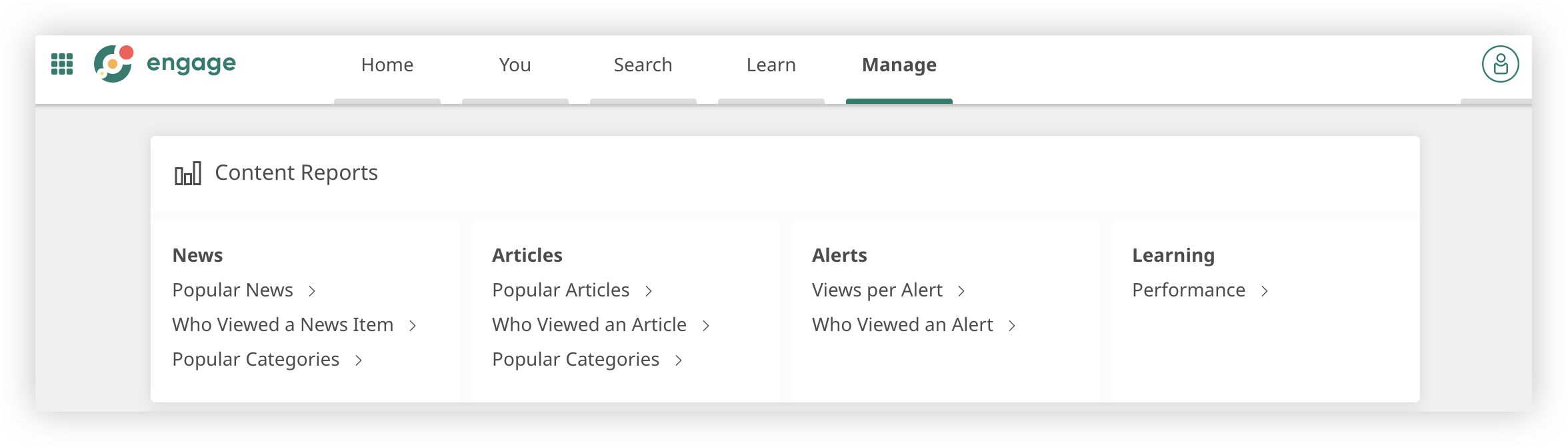 You’ll find all the learning reporting in one main area called ‘Manage’ on the web. This is only available to admin users.