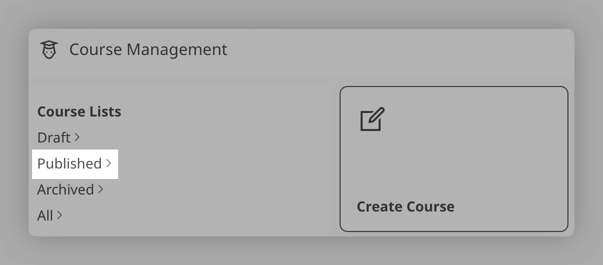 To view course analytics, on the manage page under the 'Course Management' section select either 'Published' or under the 'Course Lists' heading. You can also view analytics for archived courses.