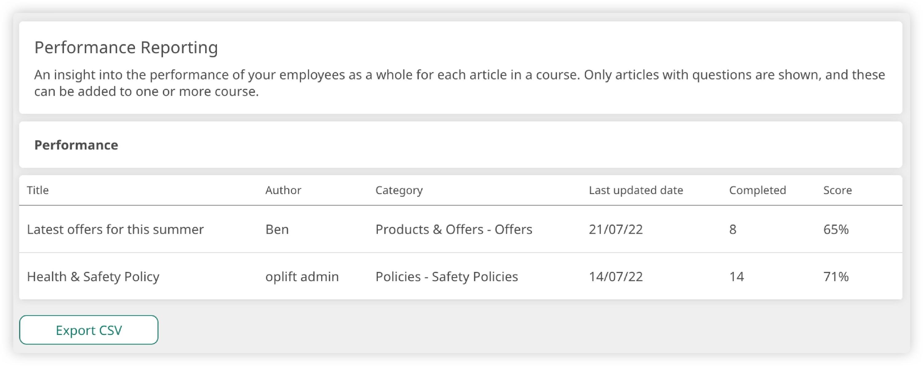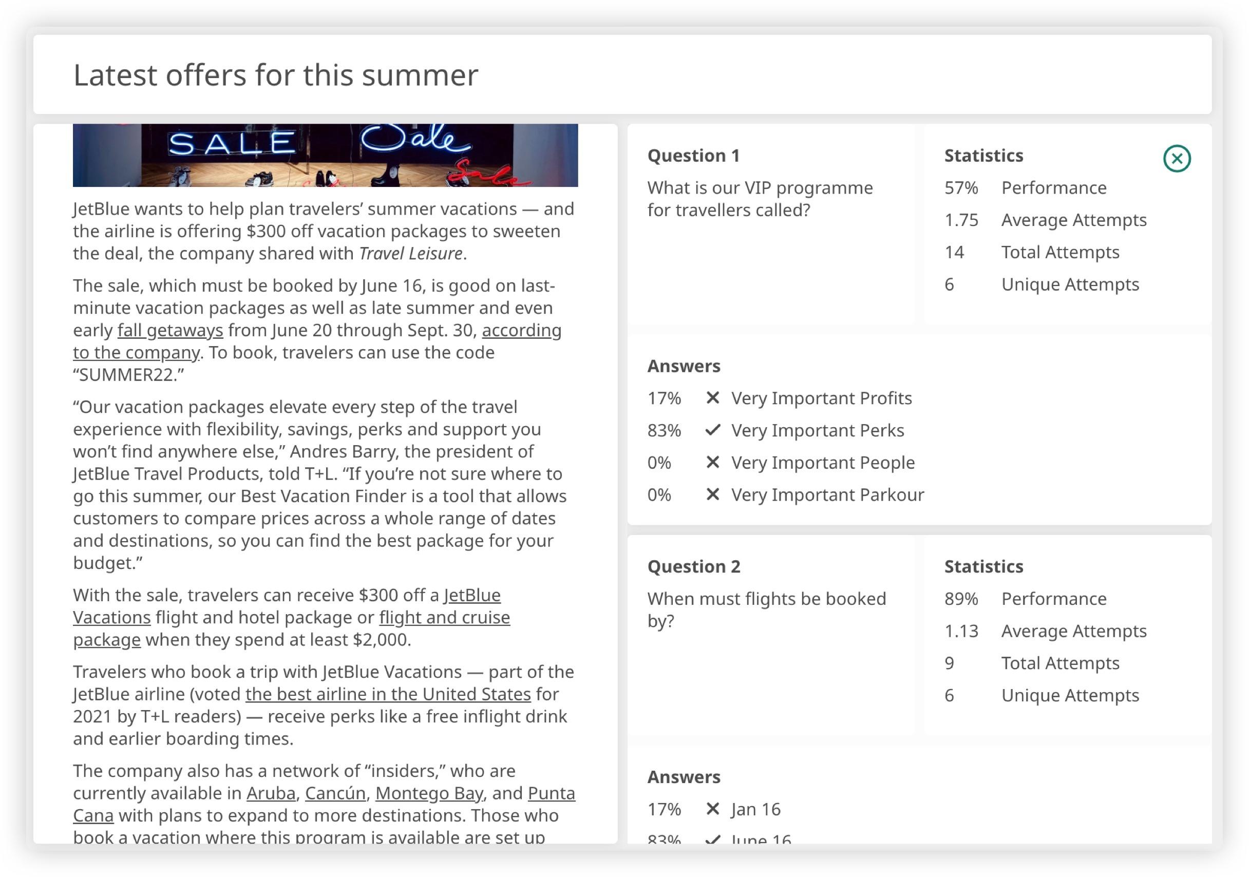 This report allows you to check how well questions are being answered for an article and to see where people are struggling to identify the correct responses.