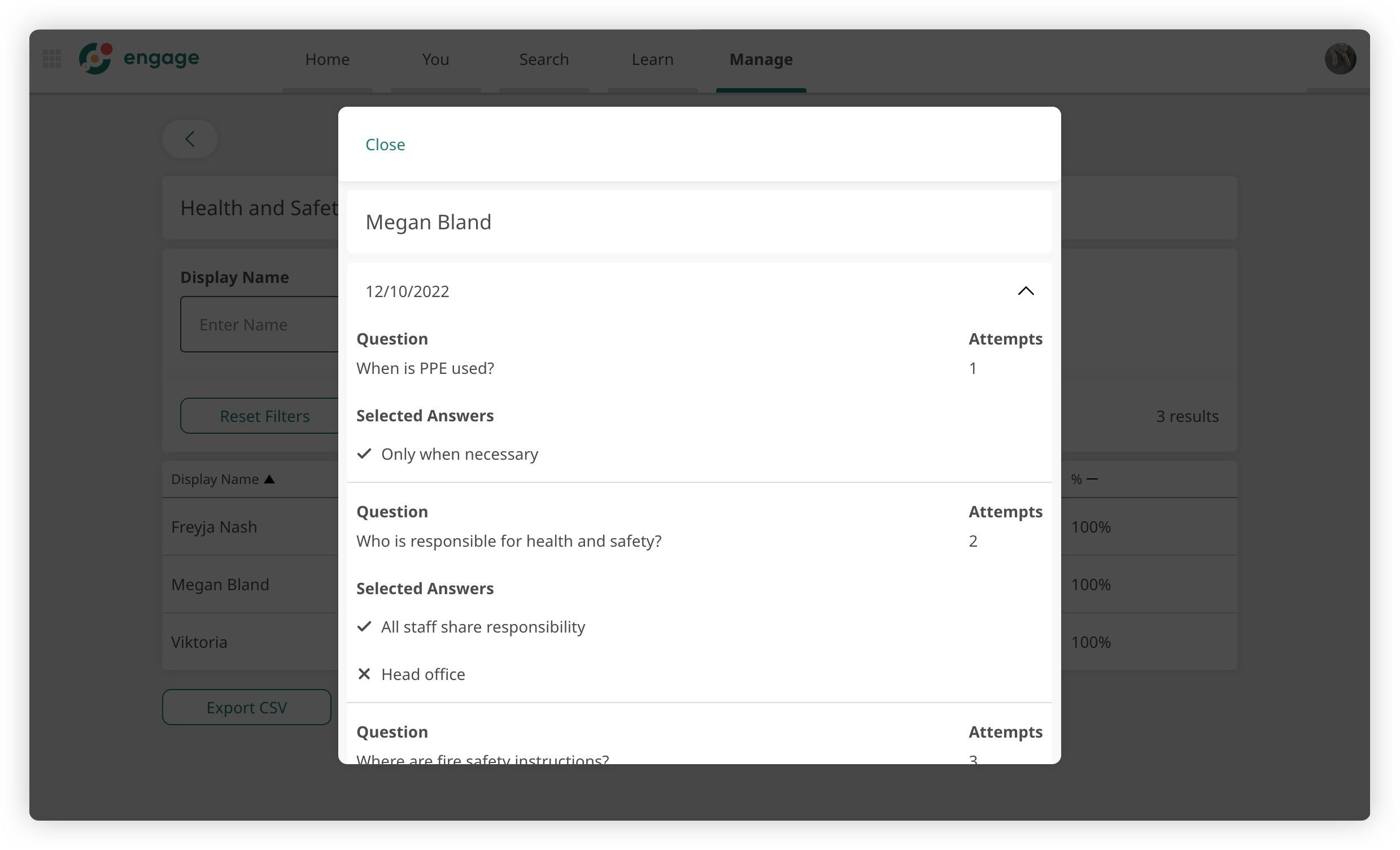 Once you have selected the row a pop up with display with the report. If the user has completed the course more than once you can select which date you would like to view.