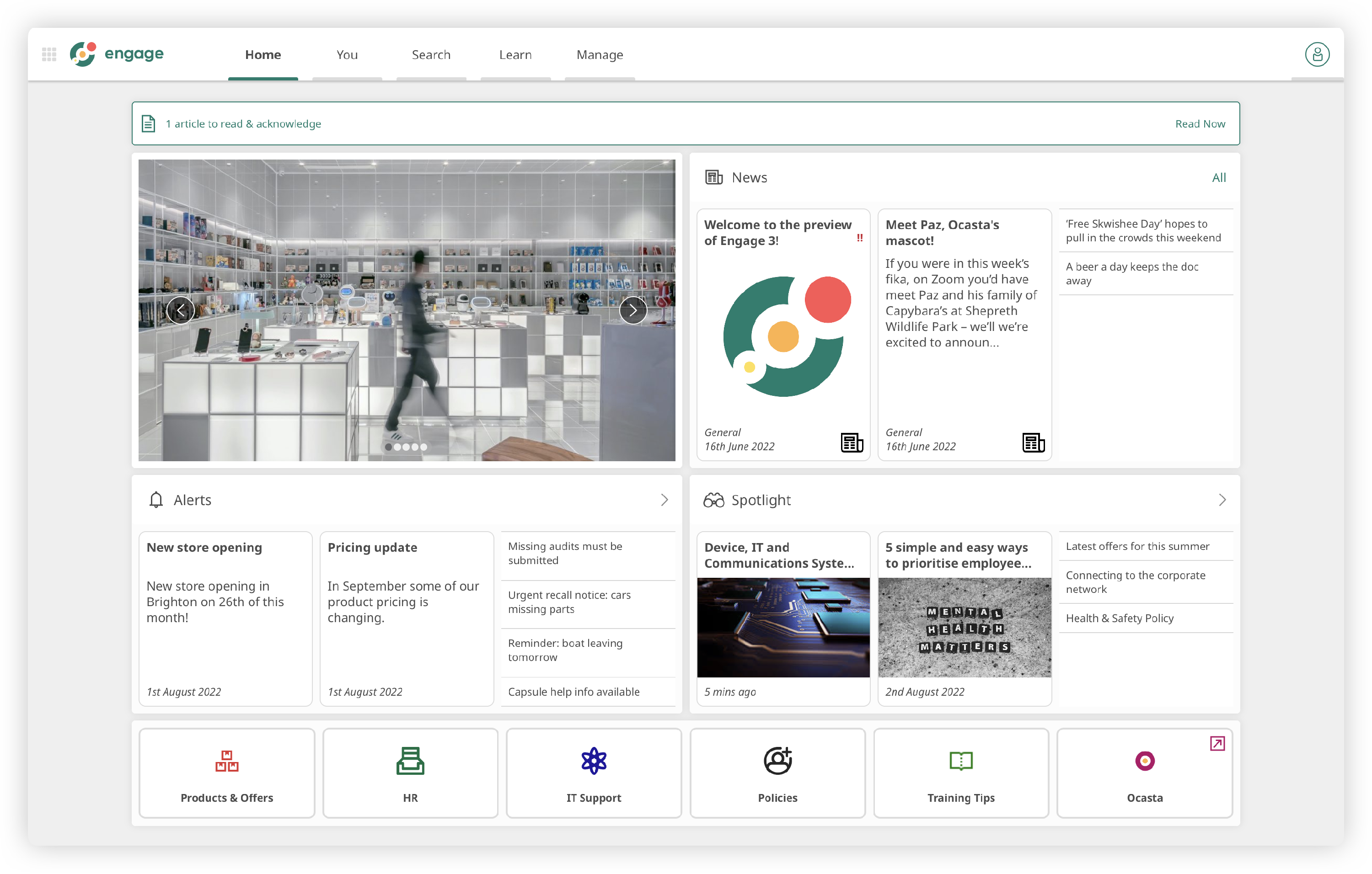 We will add some example content for you to demonstrate how Engage can be used such as, articles to show you how they are displayed, create tiles on the dashboard, set up a few news articles and banners, as well as anything else we think might be useful.