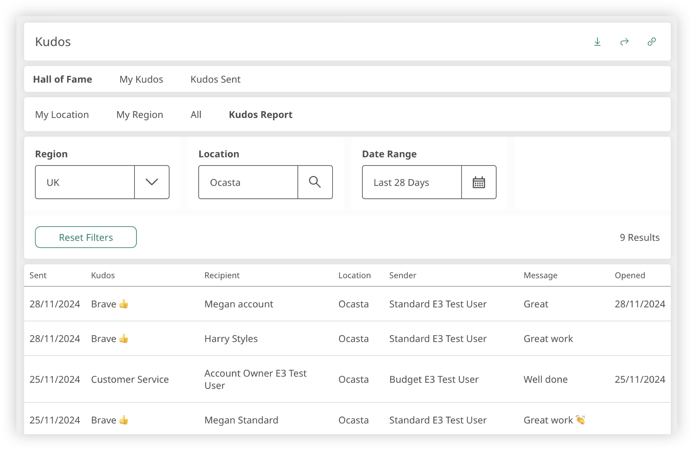 The top left of the table will display the total number of results, followed by a list view showing all Kudos awarded in the selected region/location within the specified time period.