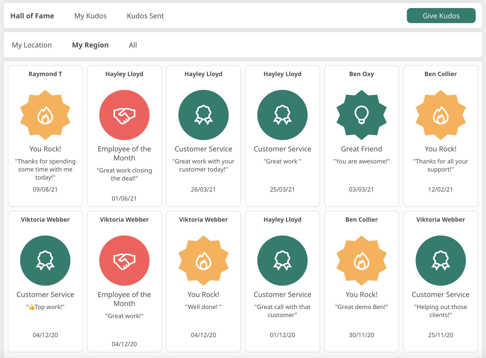 The page will default show the 'My Kudos' list. To the left you'll see the 'Hall of Fame' tab. Select it and you will see a list of all Kudos handed out within 'Your Region'.