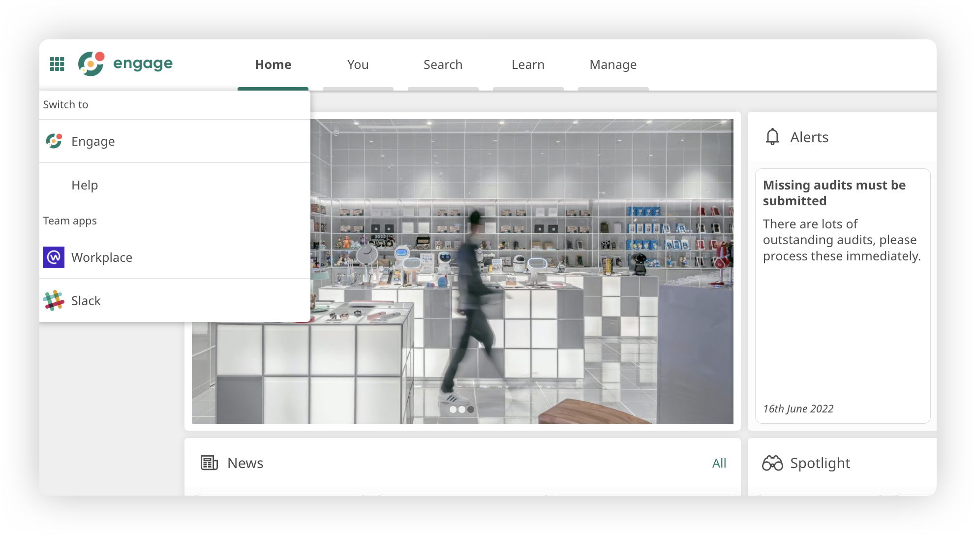 In the context of Engage, Apps are used for any external platform which your organisation uses which you would like in the platform, such as Salesforce or Slack. They can be added to the App Switcher under ‘Team Apps’. This menu list can be opened by tapping the squares icon in the top left of the nav bar.