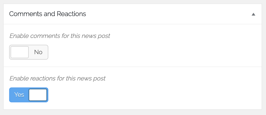 How do I set the default for comments and reactions to on or off for a news post or article?