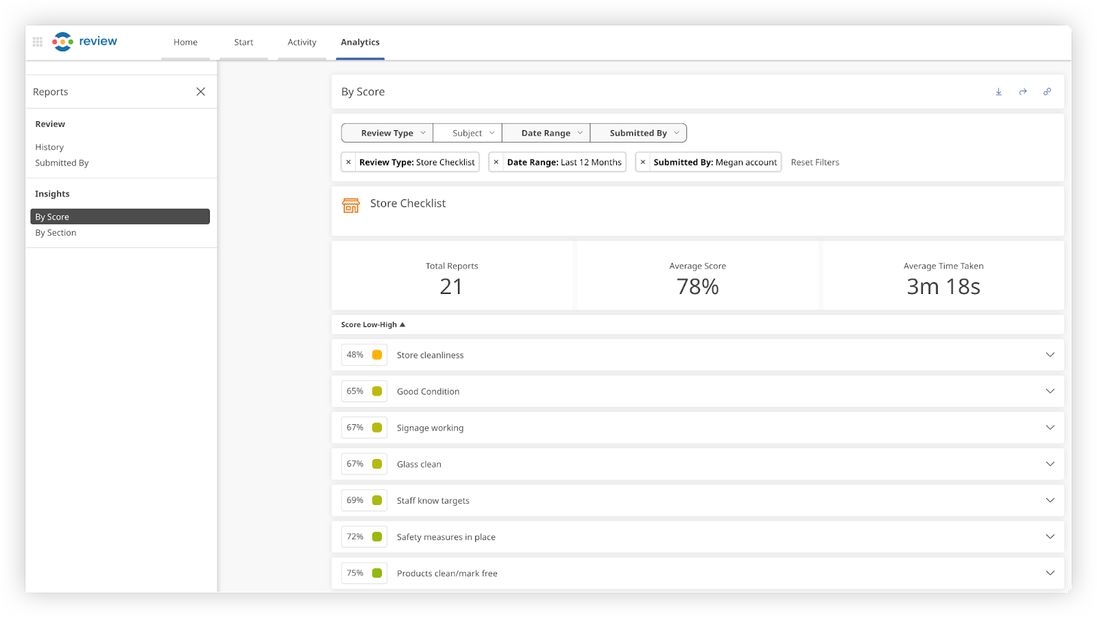 Review Metrics Overview: The first section of the page provides an overview of key Review metrics, including the average score and average time taken to complete a Review, based on the applied filters.
