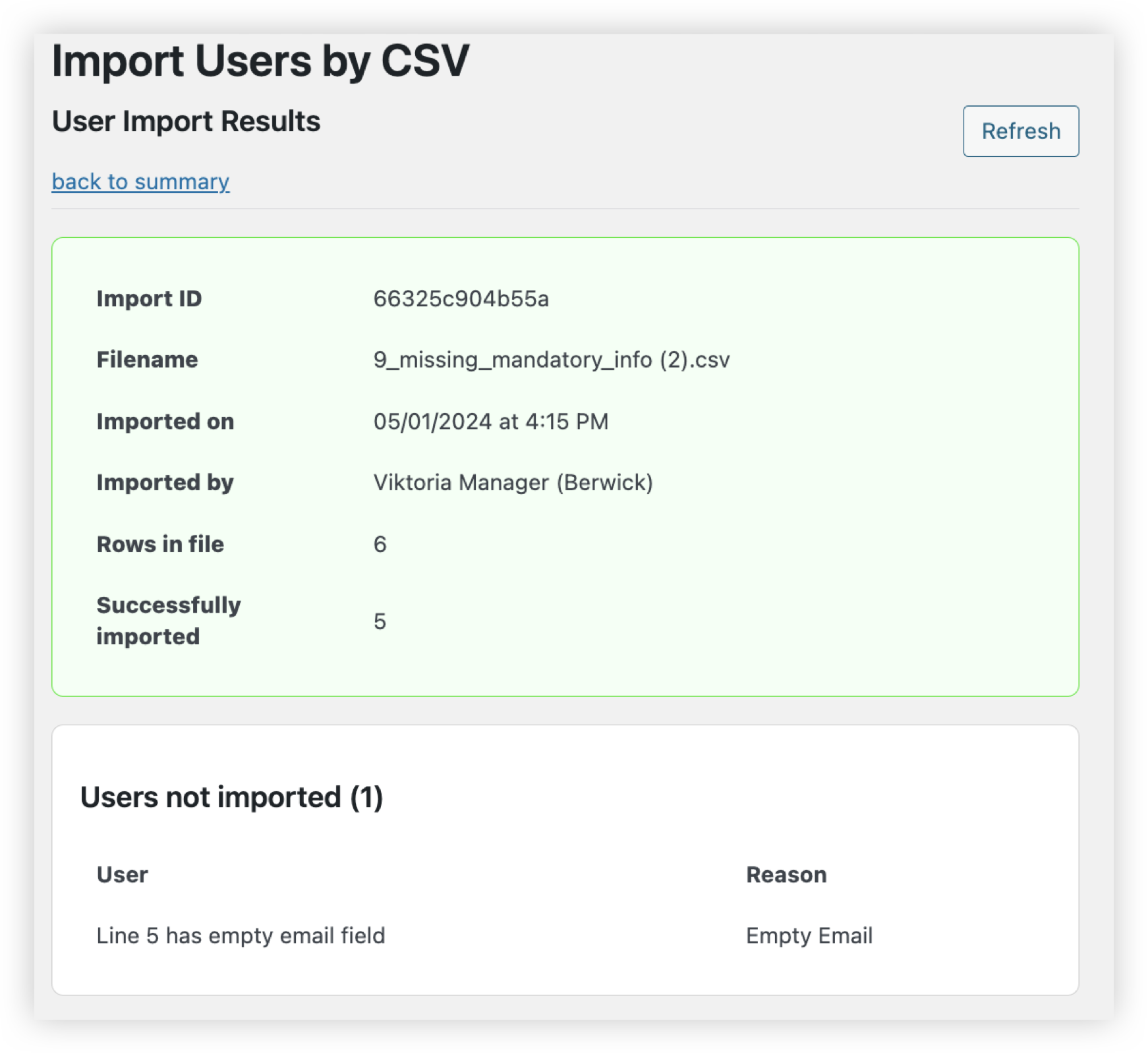 Here is an example of a successful import where 5 out of 6 users were successfully imported. You can see that the user on line 5 of the CSV file has not been imported as they didn't have an email address listed.