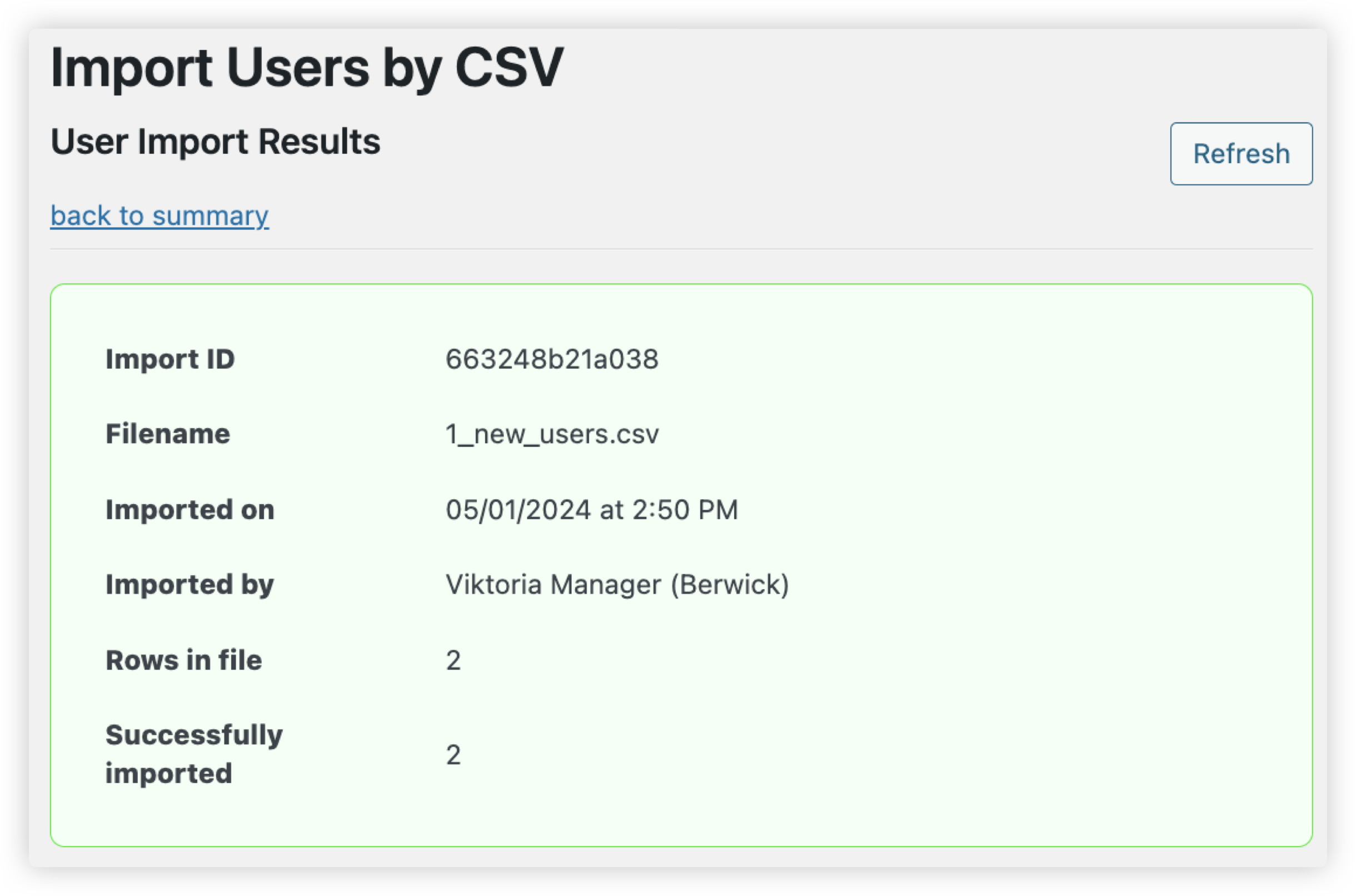 After the import completes, the report will display results similar to the example below: 2 users successfully imported with no reported errors. 👍