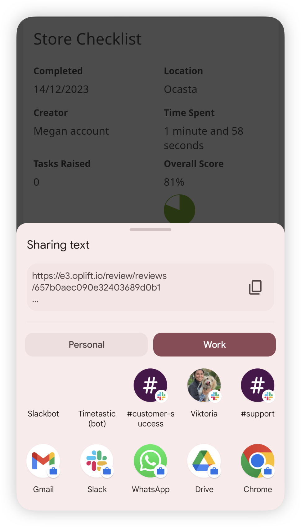 Simply tap on the share icon, and the native sharing prompt will appear, enabling you to share a review via platforms such as WhatsApp, Teams, Slack, and more.