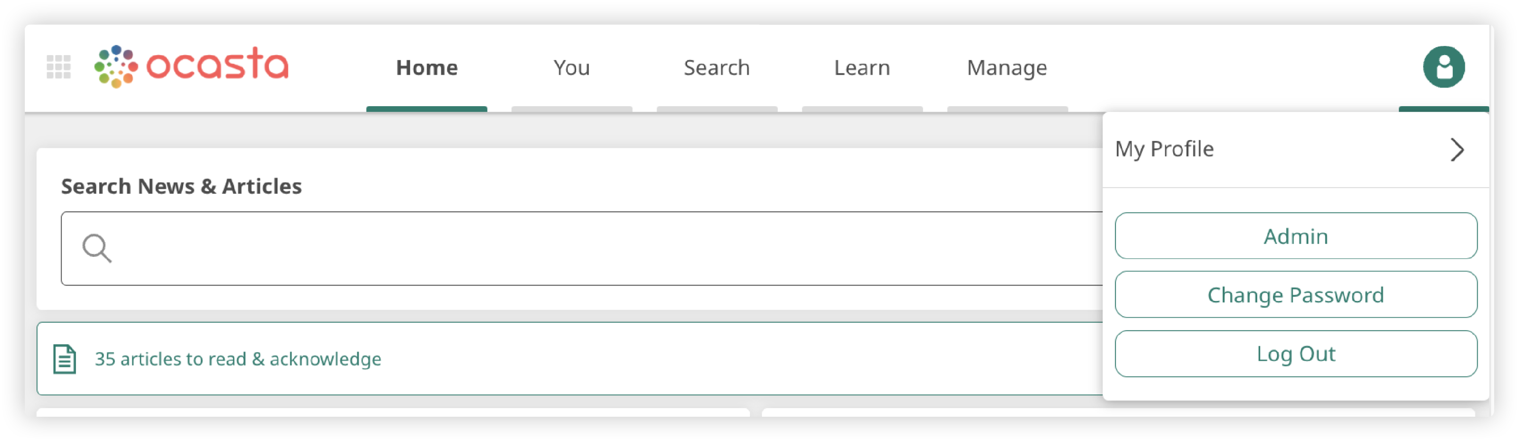After you login to Ocasta you'll see either a circular avatar icon or your profile picture, if you've added one, in the top right of the navigation bar. Select it and you'll see a dropdown list of options, select 'My Profile at the top'.