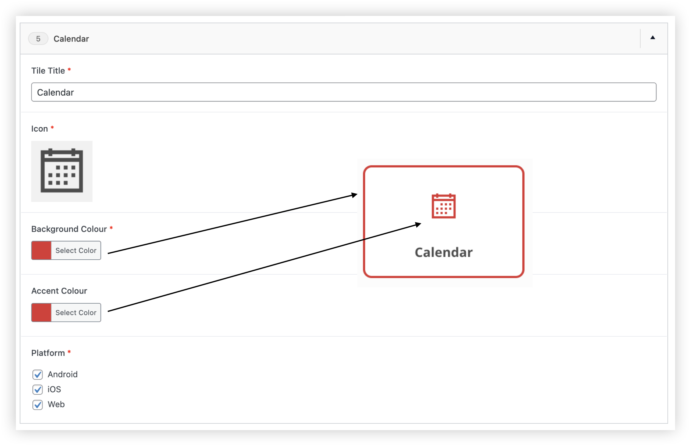 - Accent colour - this option will adjust the colour of the icon for the tile. If you have uploaded an image set this colour to Clear.