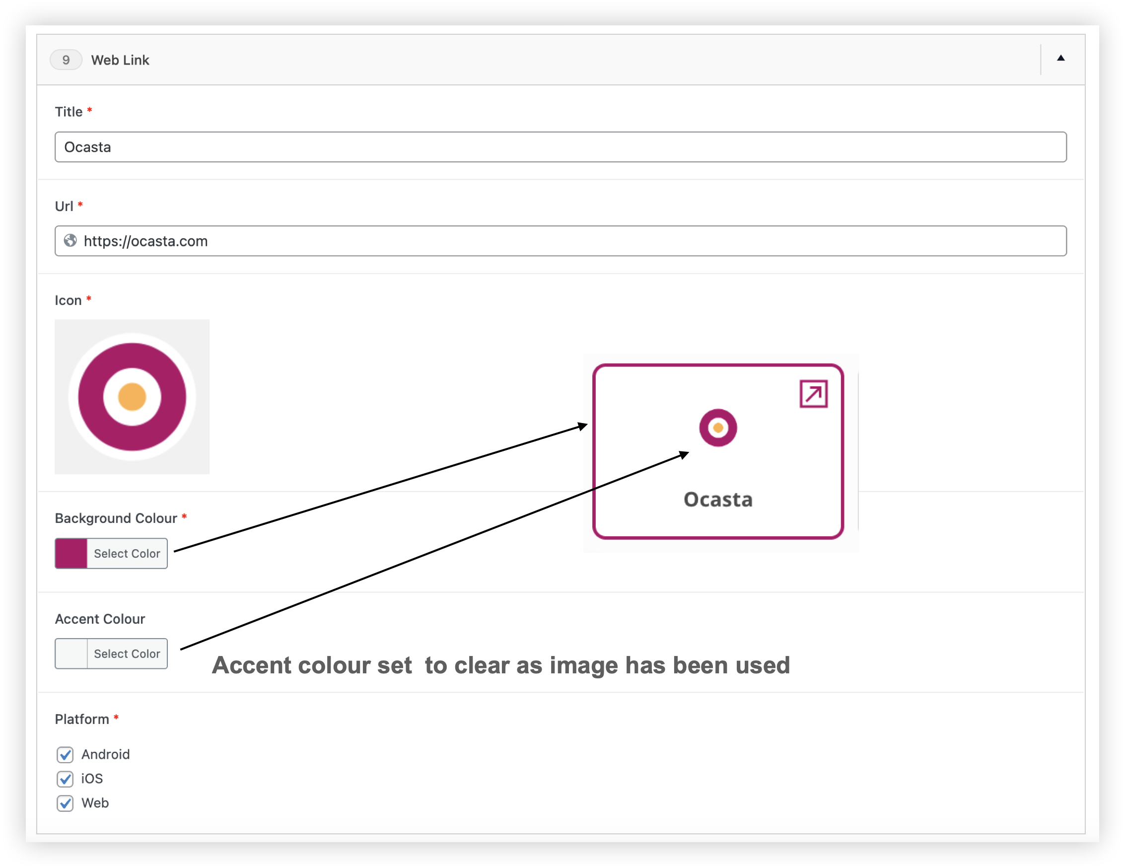 - Accent colour - this option will adjust the colour of the icon for the tile. If you have uploaded an image instead of an icon, set this colour to Clear.