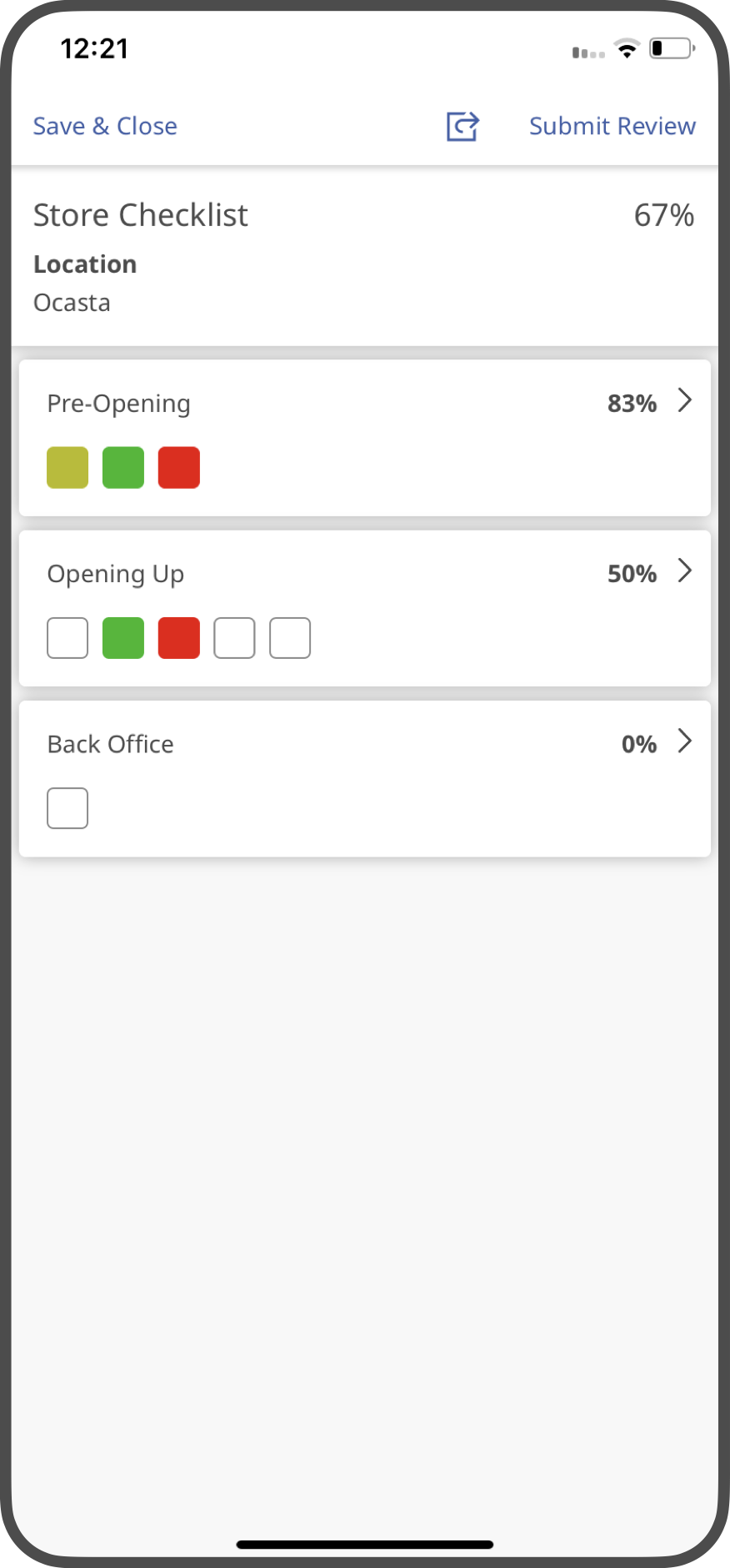 A 'Previous Report' section will display a read only view of a previous report. For example, a Regional Manager may be returning to a store to carry out a report and may want to check the previous scores for that particular report. For example, the score for cleanliness may have been poor previously, so they can check if the issue has improved or not in the new report.