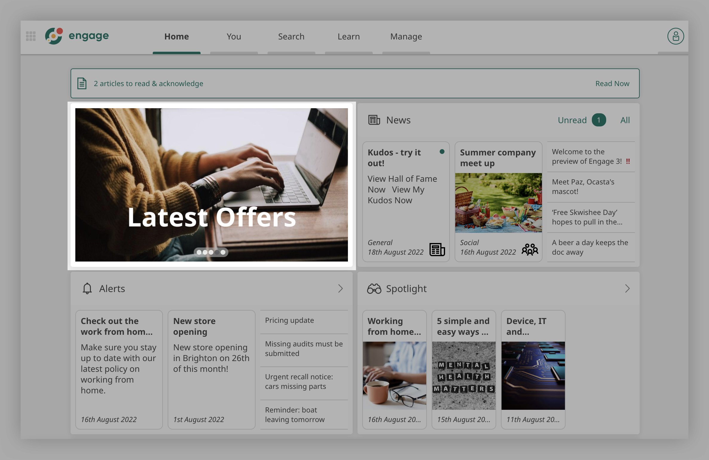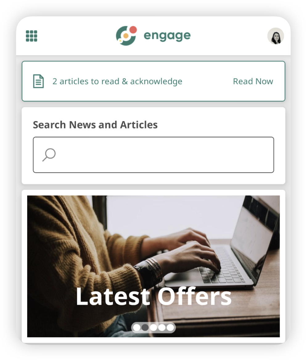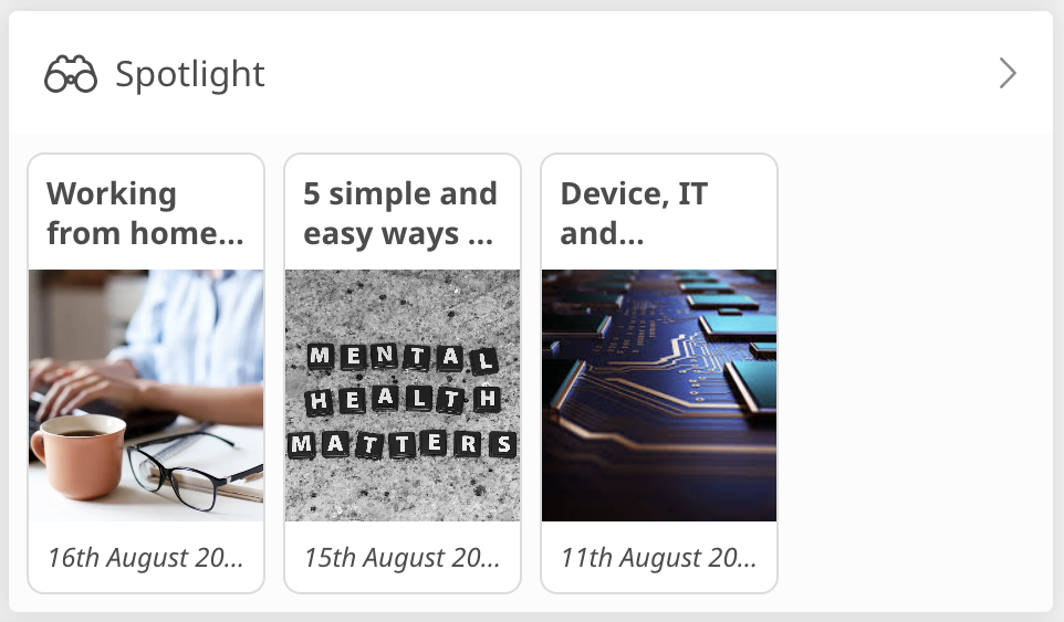 If you select for an article to appear in 'Spotlight' then it will show up in the Spotlight section on the home screen of Engage. This section can be used to focus employees attention on important content or on an article that has been recently updated.
