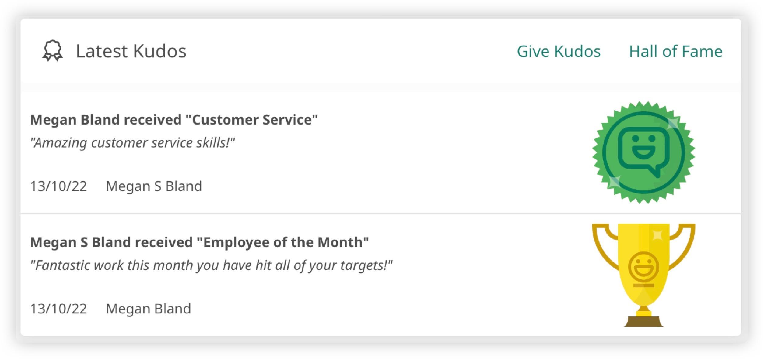 Kudos are awards and encouragements that can be handed out by a member of staff to another member of staff in the same location. The Kudos component on the home page shows the most recent awards handed out within your organisation. They will only display once the recipient has opened a Kudos.