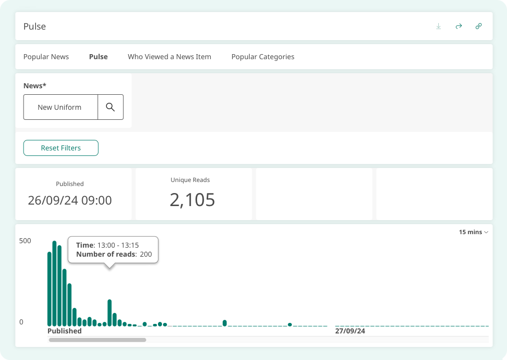 Pulse offers detailed insights into the performance of your news posts. Select Pulse from the News section in Content Reports, then search for and select a news item from the dropdown list. You will see the date and time the post was published, along with the total unique reads since publication.