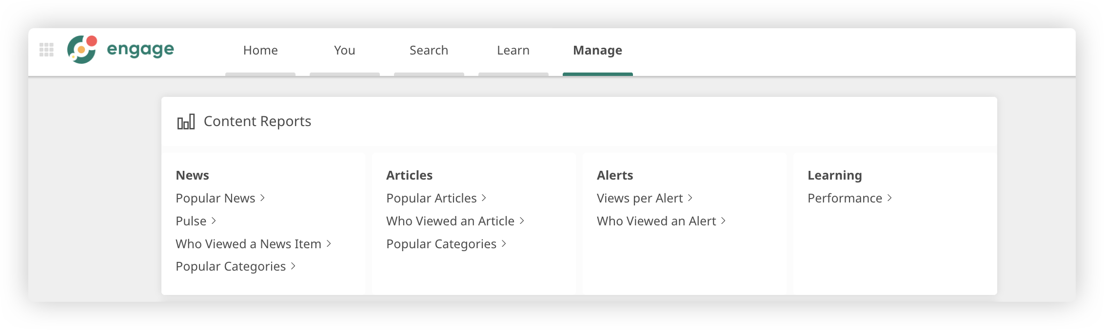 You’ll find all the reporting for News, Articles and Alerts in one main area called ‘Manage’ on the web. This is only available to admin users.