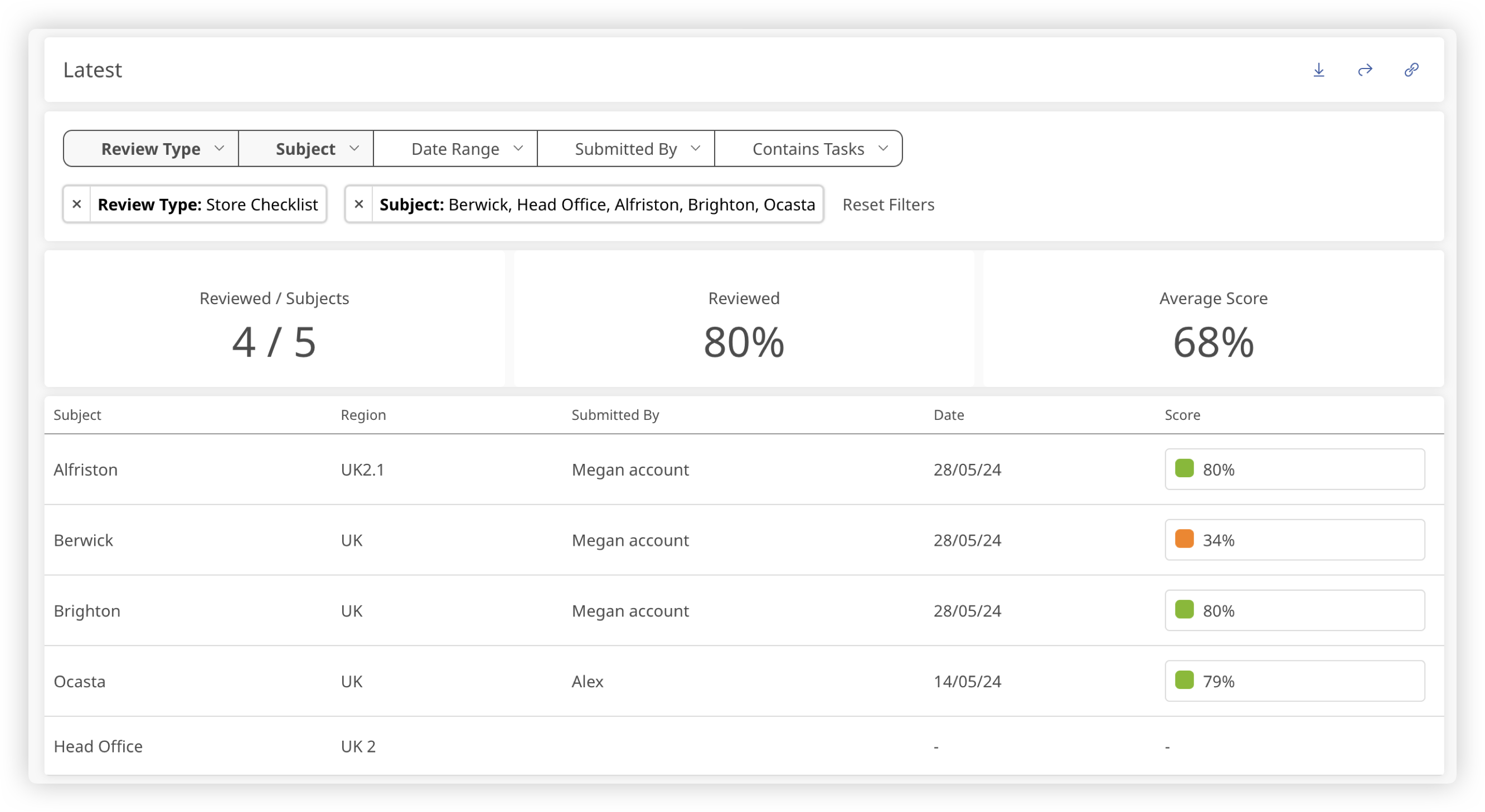 Review Latest Table: Below the metrics overview, you'll find a detailed table listing the most recent reviews for the selected subjects (locations or individuals). You’ll be able to see information including, the subject, Region, who submitted the Review, the date it was submitted and the score.