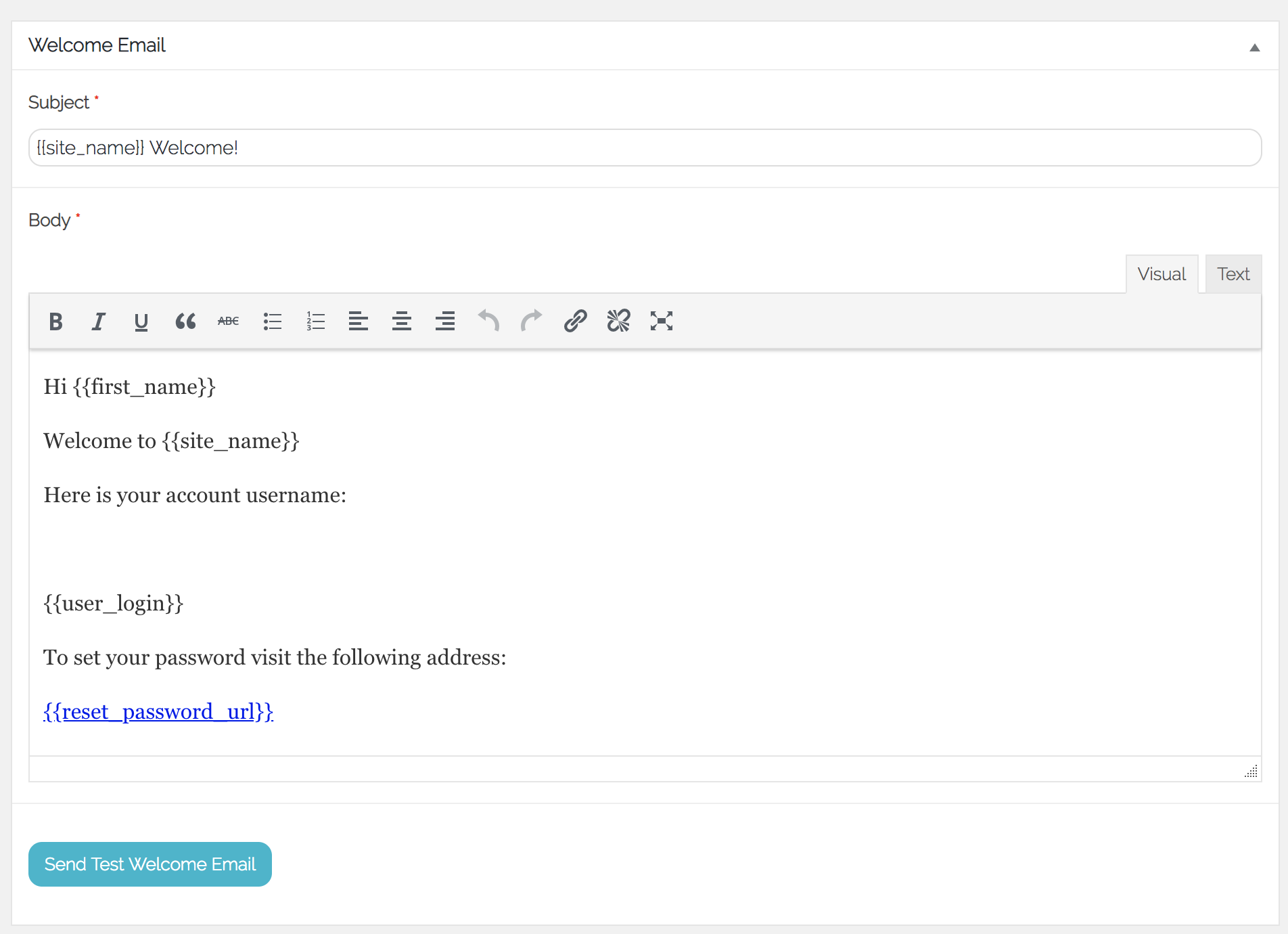 Body - type your welcome email in the box and use the template tags to customise your content