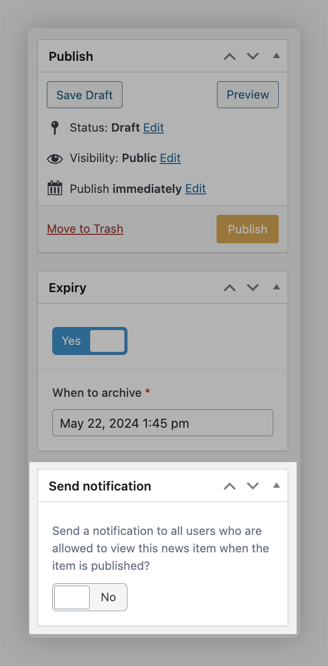 Toggle the option to 'Yes' if you wish to send a notification to all users with permission to view the news item.