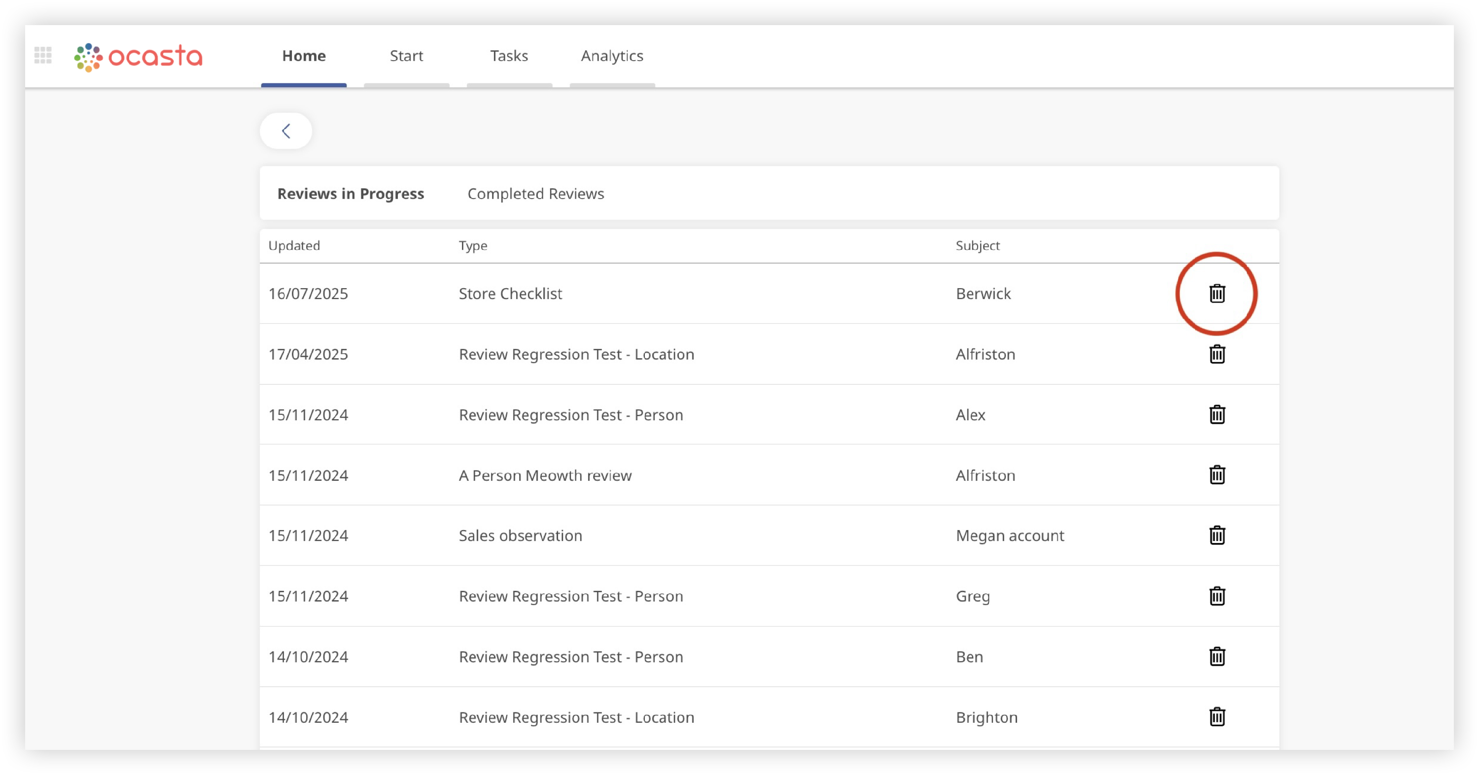 Please note, you can only delete your own in progress reviews.
