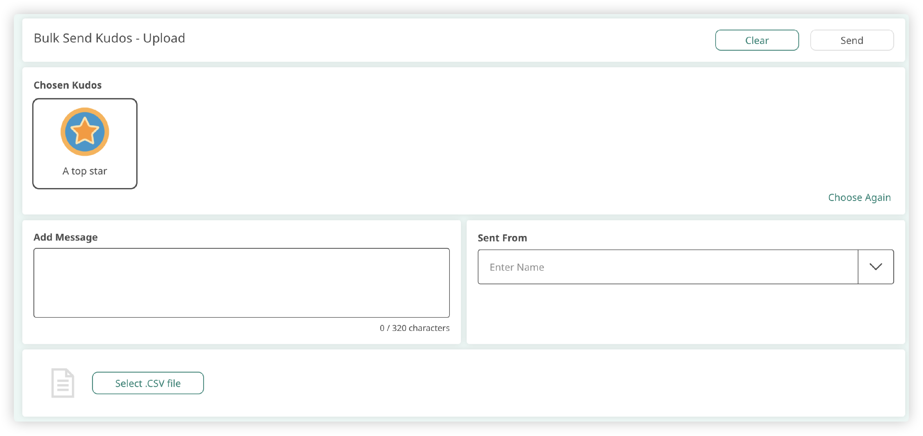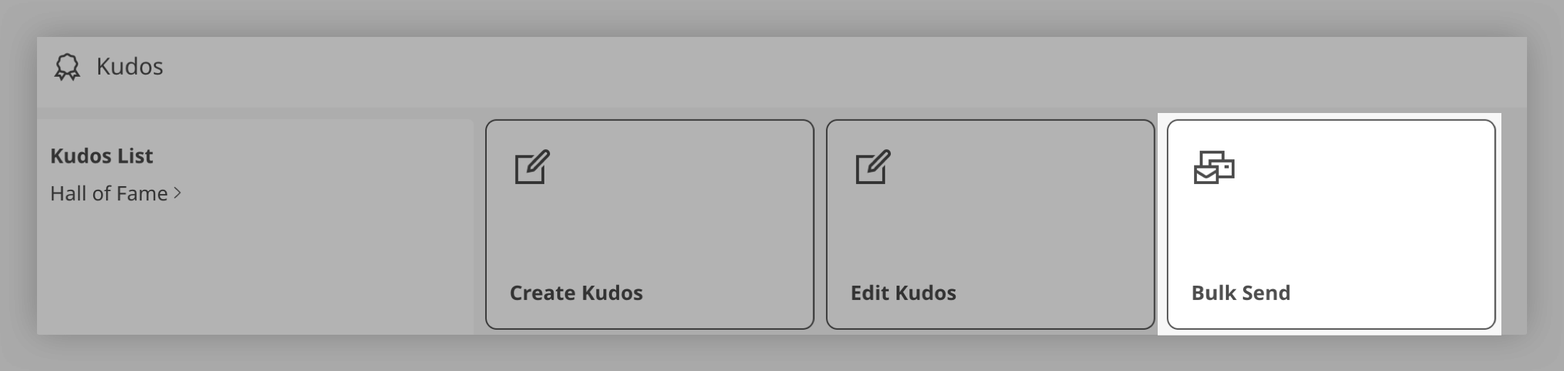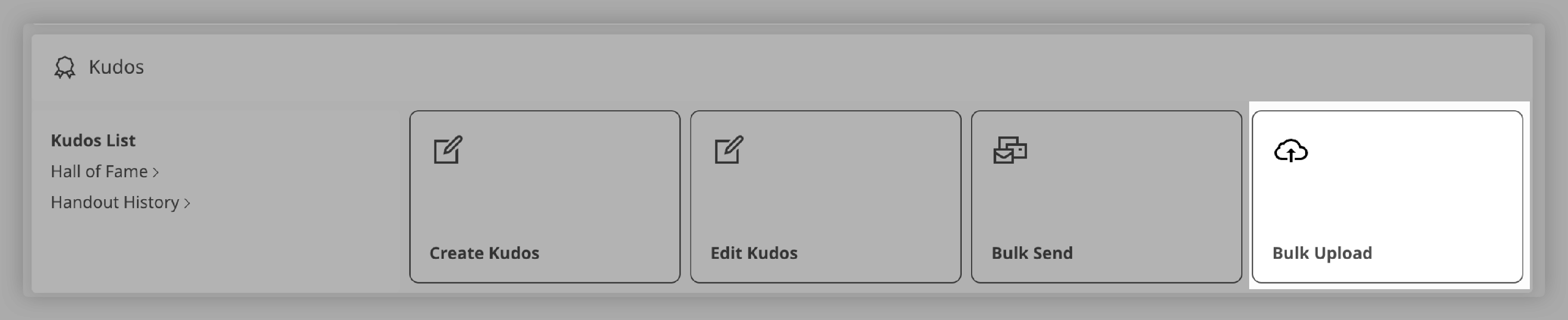 There are two options available for kudos: Bulk Send and Bulk Upload.