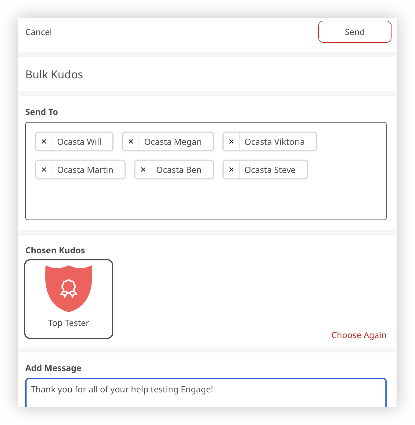 Bulk Send is ideal for sending kudos to a small team, as it requires manually entering each username.