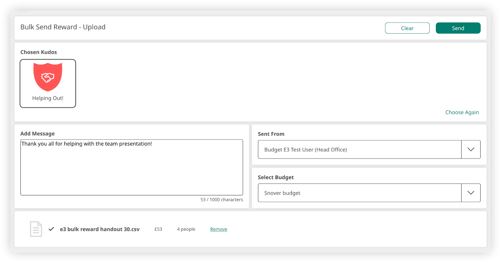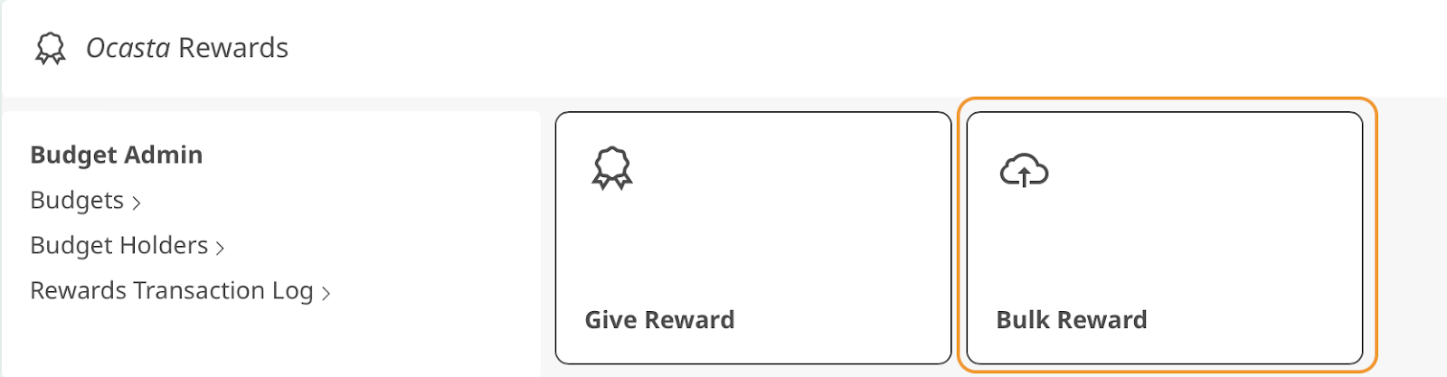 There is an additional option called Bulk Rewards if your organisation also uses Kudos Rewards. Bulk Rewards is a feature that allows users with the right permissions to quickly distribute the same Kudos and reward to multiple recipients by uploading a CSV file. Skip to this section.