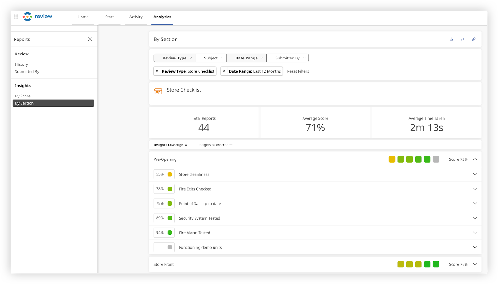 Insights By Score Table: Below the metrics overview, you'll find a table that lists the different sections for the Review type selected and an overall score for each section. Each section can be expanded to show all insights they contain. You can open up the specific review from this view if needed.
