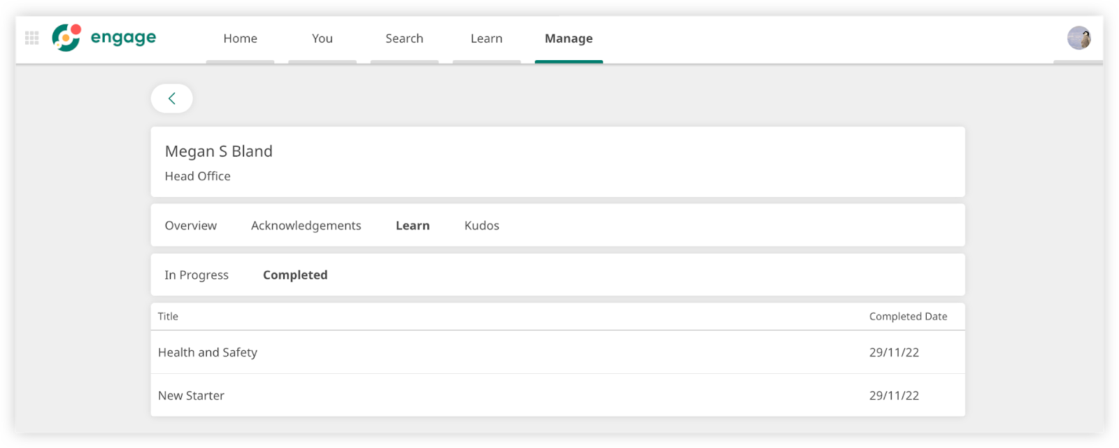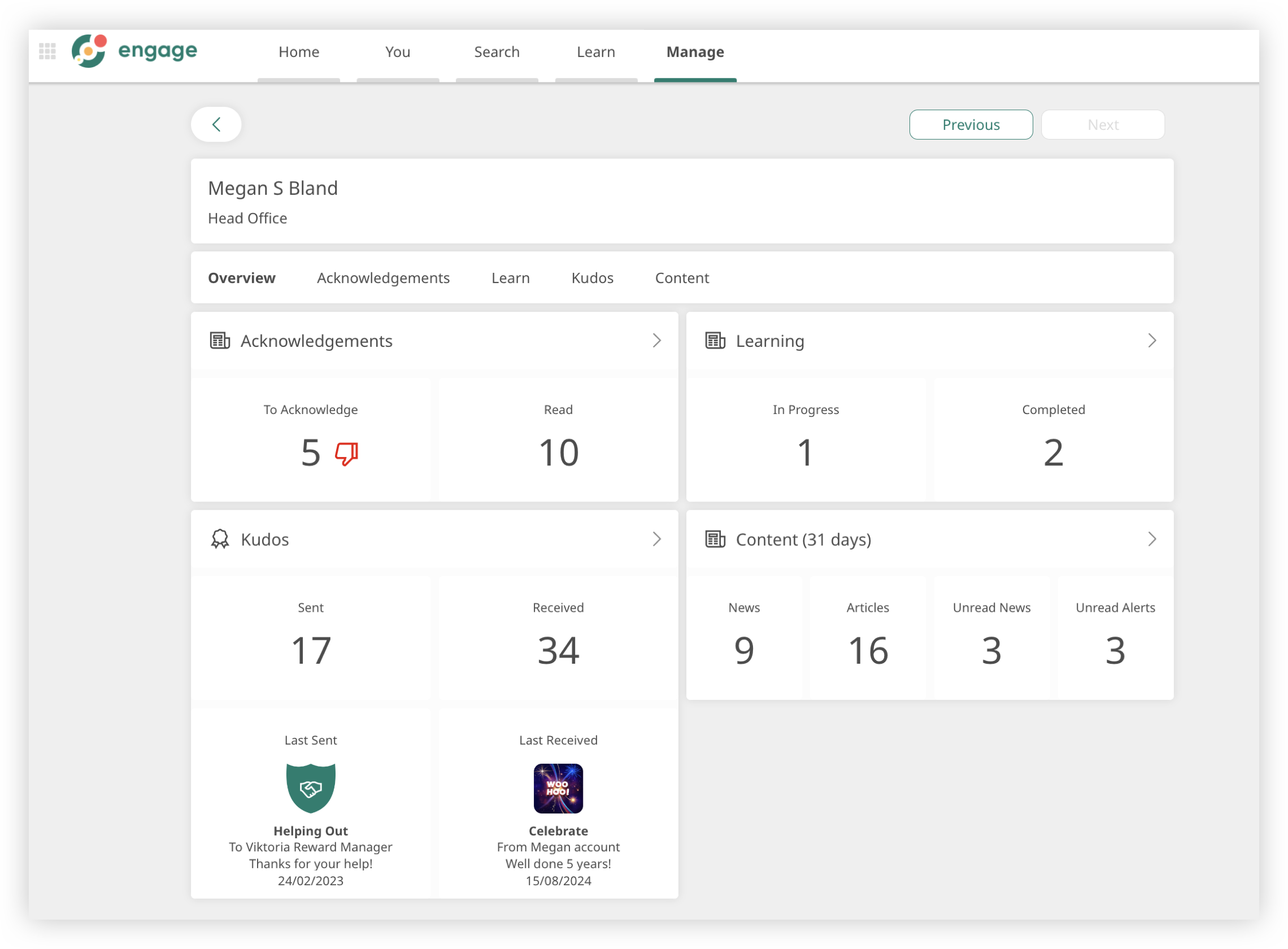 You will be directed to an Overview page for the selected user where you can begin exploring the engagement statistics, or use the sub-headings to dive into the areas of interest.