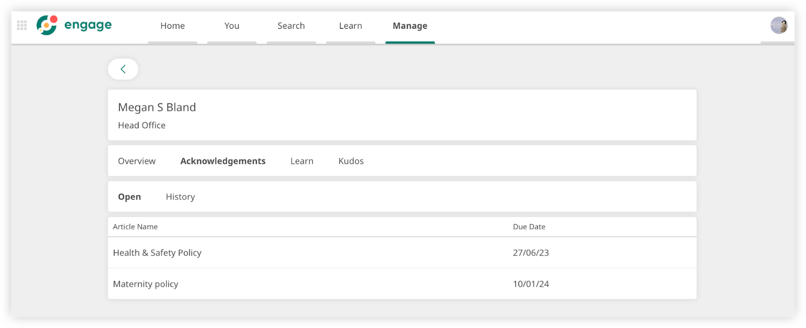 Select either option to drill down into the specific articles the user has or has not acknowledged.