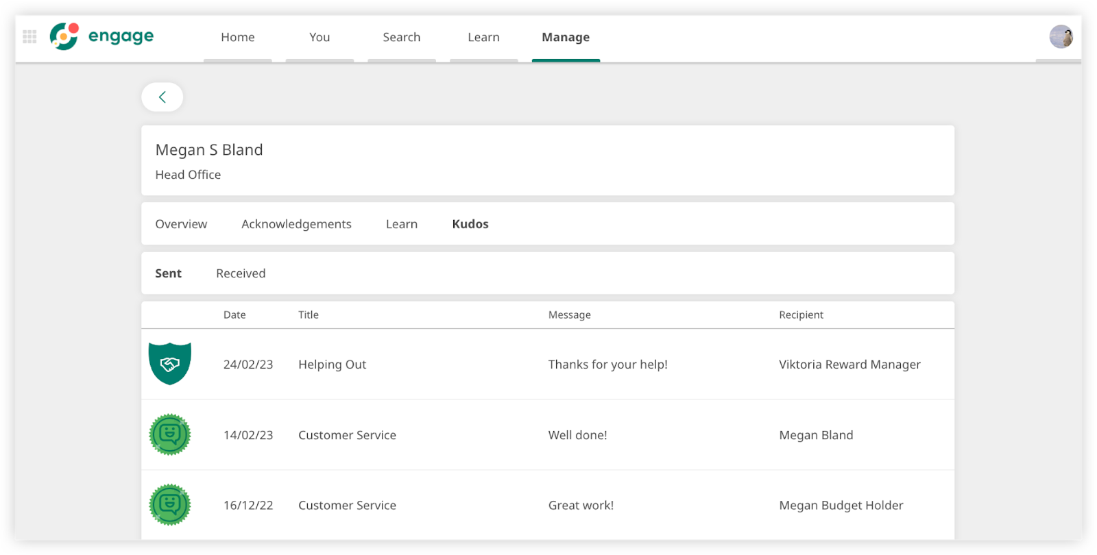 Select either option to drill down into the details of which Kudos the user has sent and received, and from who.