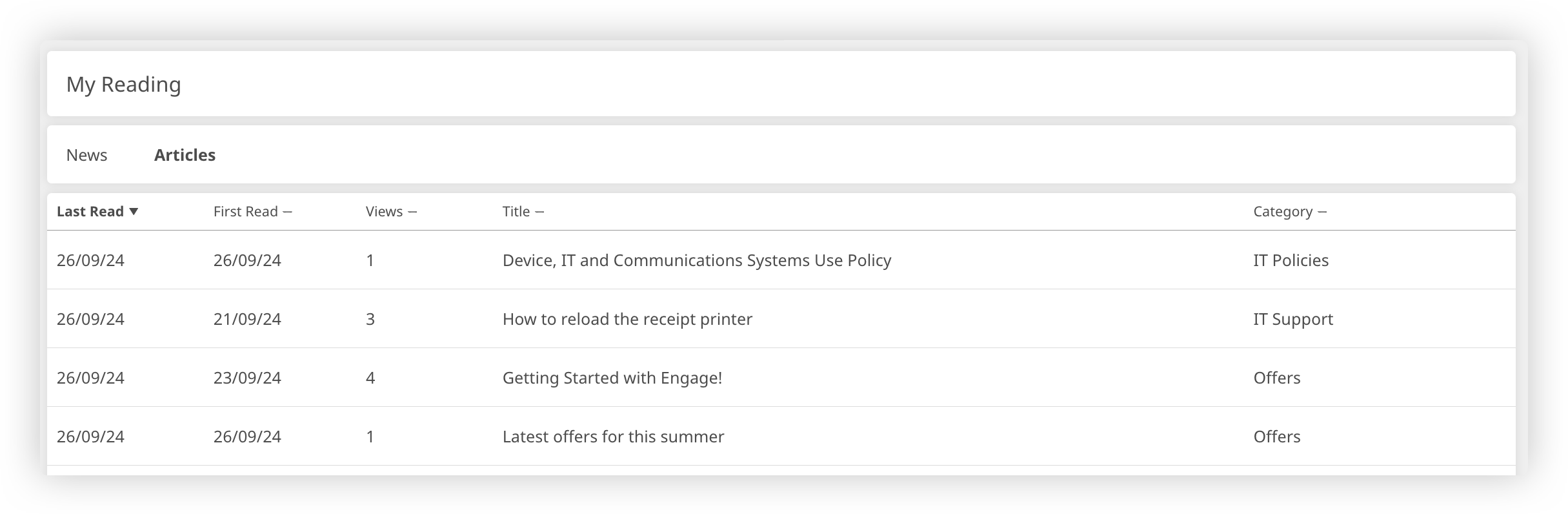 You can easily see your reading history by selecting either Articles or News, and view a comprehensive list of content you've read in the last 31 days. Additionally, you'll be able to see the first and last read dates for each item, giving you a clearer picture of your reading activity.