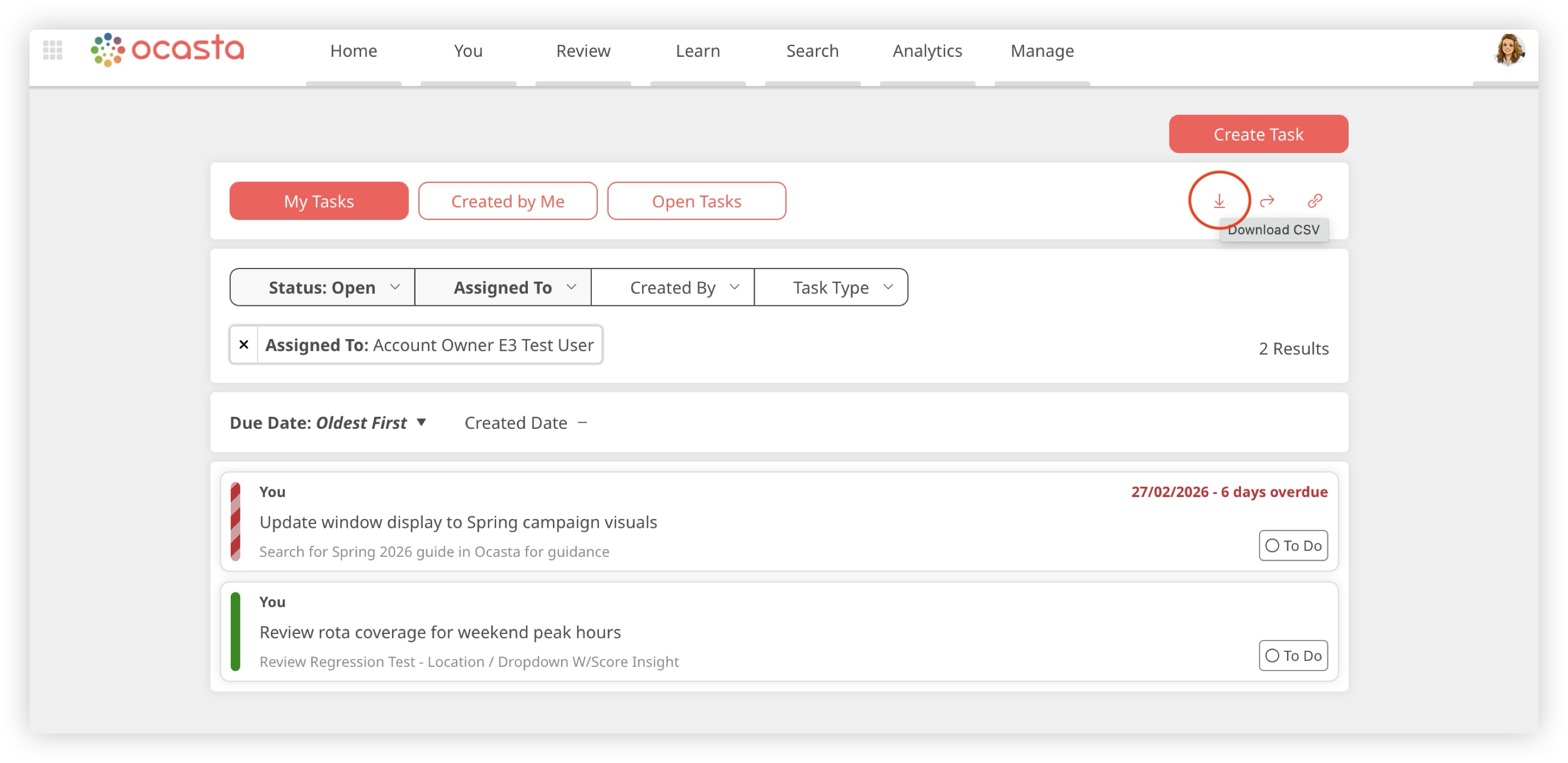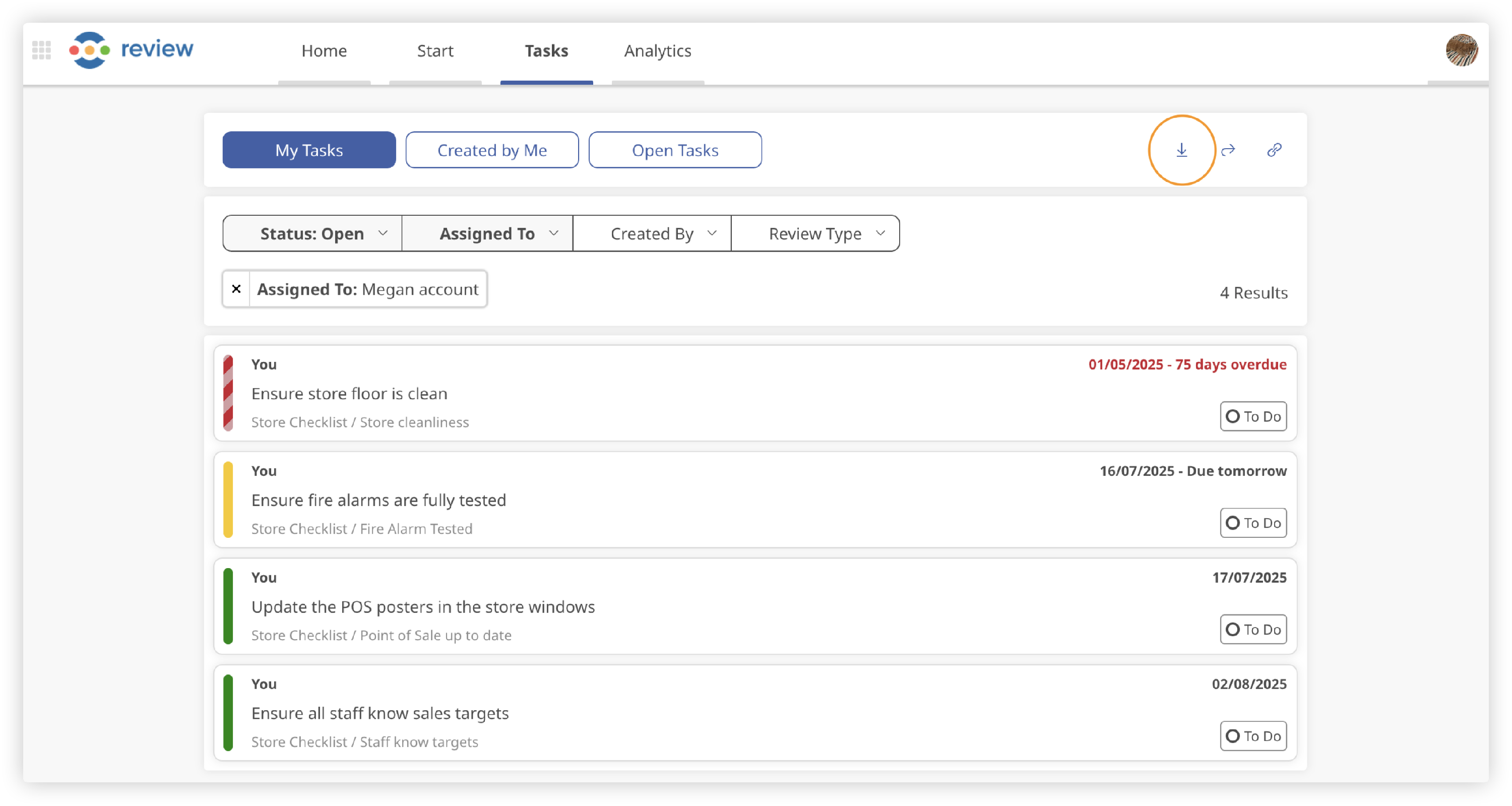 You can export tasks to a CSV file for easy analysis and reporting using your preferred tools.