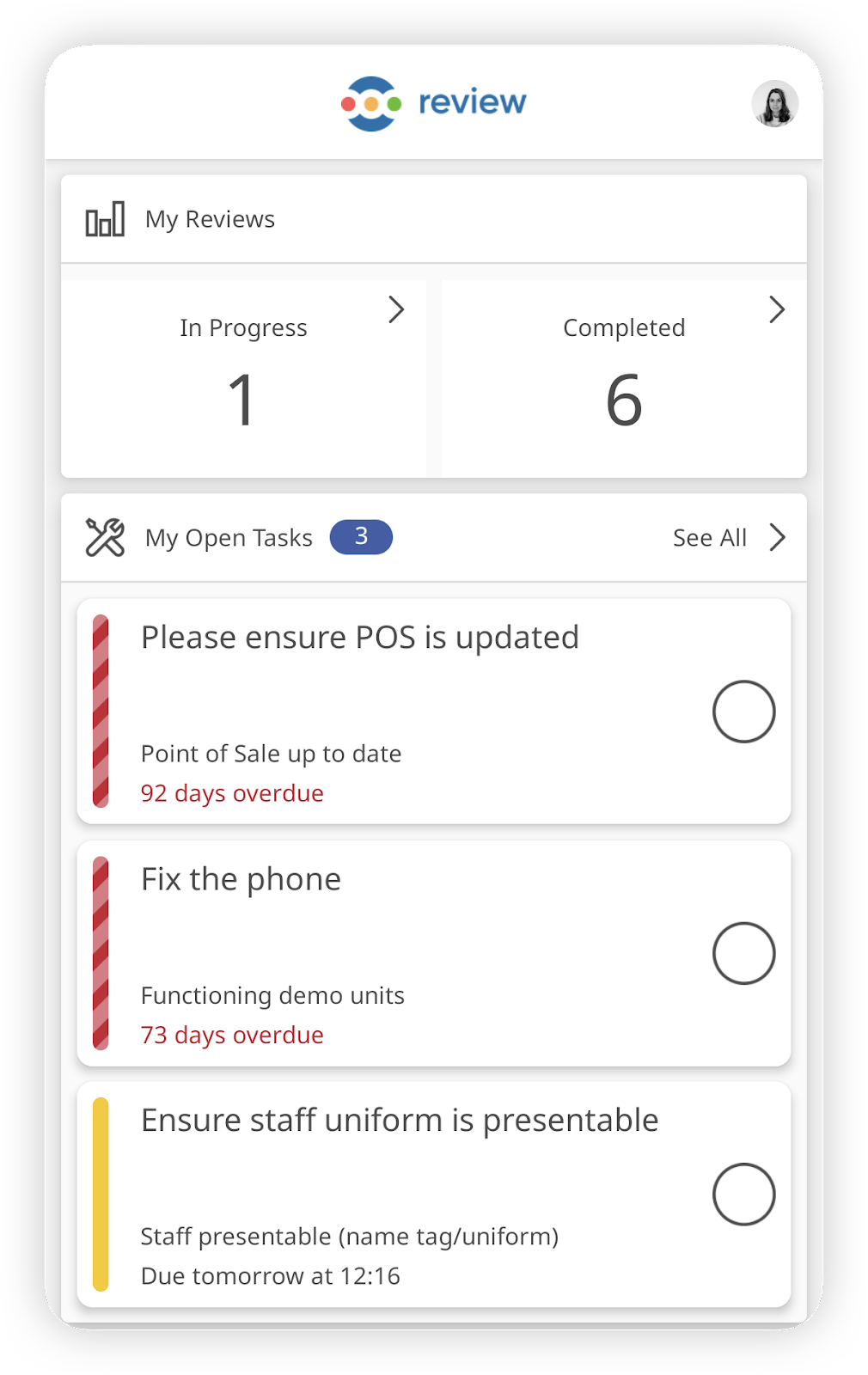 Your custom background colour and company logo will now display on all pages of the Android app, as it currently does on iOS and the Web. On the start page, where you can see all the reviews available to you to complete, the review icons now support custom icons and colours which means that the app maintains the look and feel of your brand across all platforms.