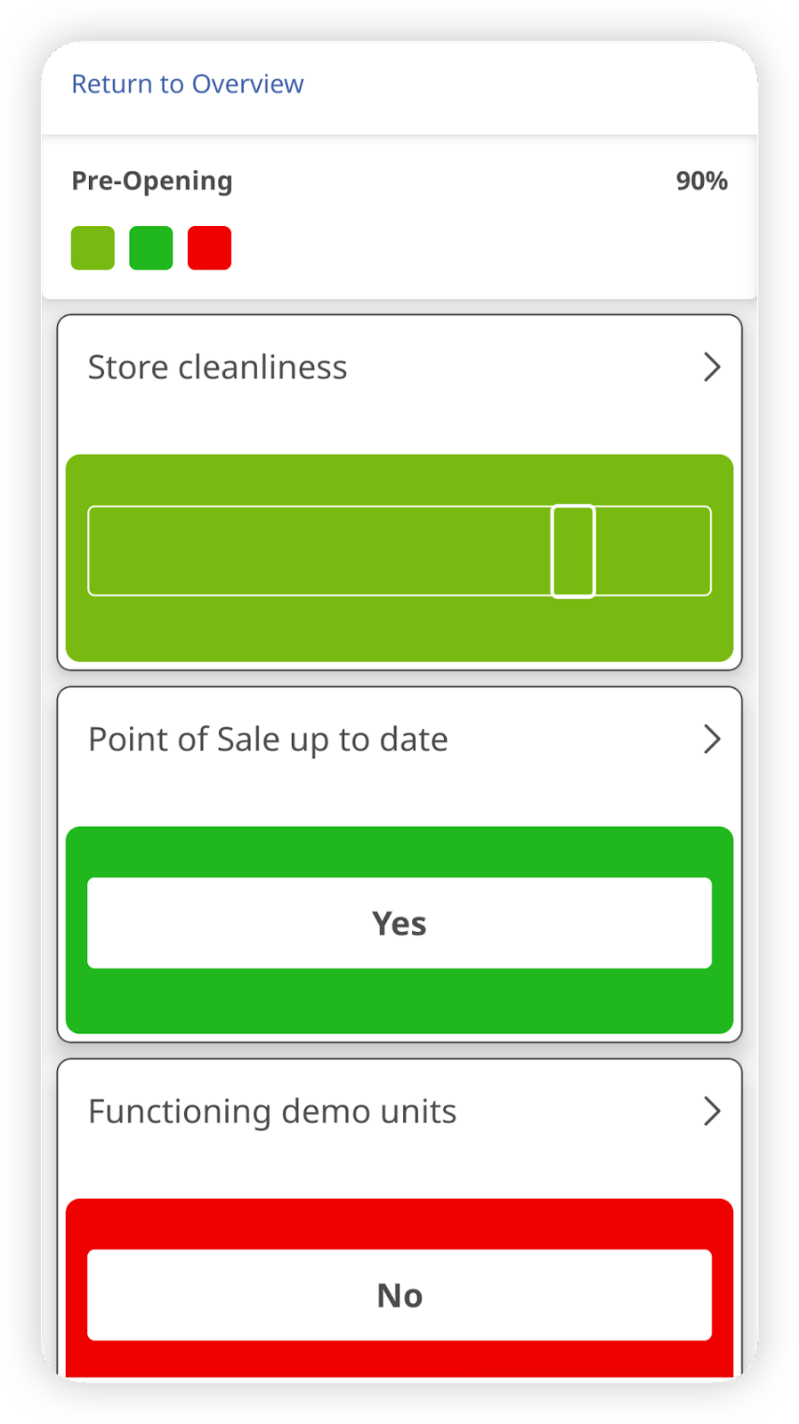 Once you’ve completed the section, you can either swipe right to move to the next section, left to go back to a previous section, or return to the overview page. This allows you to complete the review in the most efficient way for you. Use the overview page as your focal point to see a summary of what you have completed, the scores for each section and which sections and insights you have left to complete.