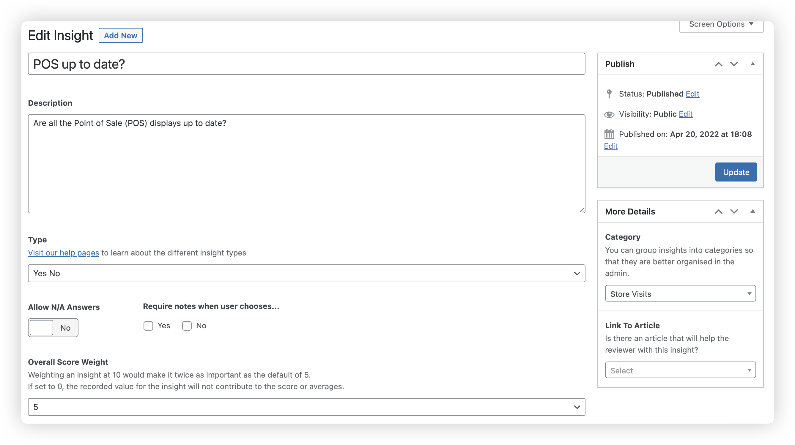 Overall Score Weight - for 'Vibe', 'KPI', 'Yes/No' and 'Percentage' insight types you can select an overall score weight. There might be some insights which you view as more important than others and so you may want to give that insight a higher weighting, so that it has more of a bearing on the overall score. For example, if you had two insights, one for how clean the sofas are in a store and another for if the marketing posters are on display, you could set the weighting of the second insight to 10 and the first insight to 5. Therefore the second insight would have double the impact on the overall score than the first insight.
