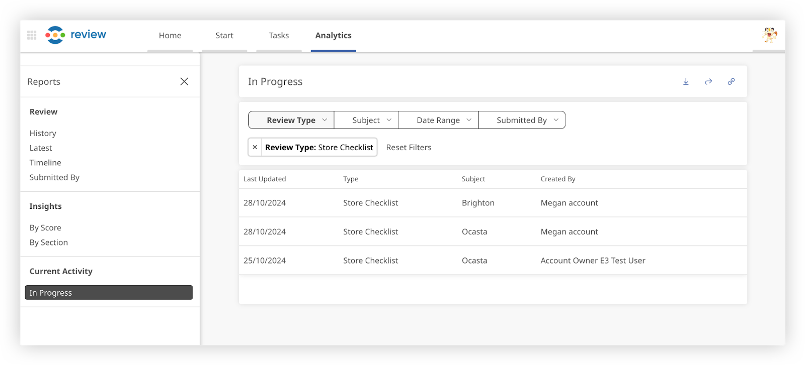 As part of the updates to task management, reviews in progress reporting have moved to the Analytics page (web only). In the new “Current Activity” section, you can find a comprehensive list of all reviews in progress, with visibility limited to the reviews you have permission to access.