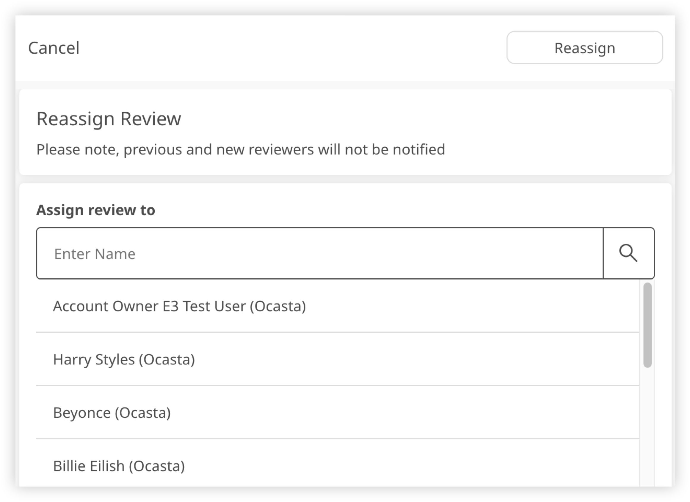 A pop-up window will appear. Type or search for the user you want to reassign the review to. Once you've selected the new owner, click the Reassign button at the top-right of the pop-up.
