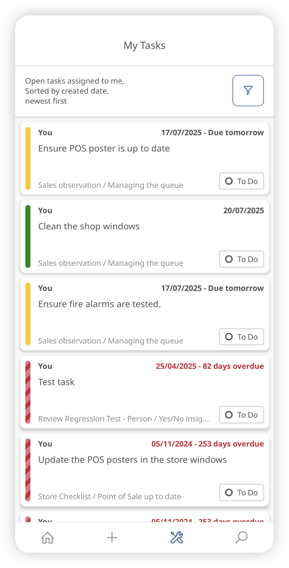 The Tasks page on the web helps you stay on top of what needs doing. What you see depends on your role and location permissions, so you’ll always see what’s most relevant to you.