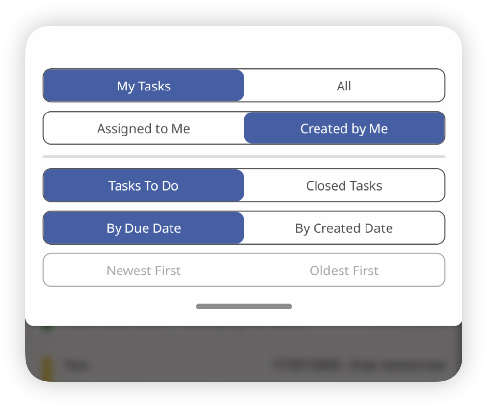 Sort the list by due date or created date, and choose whether to show the newest or oldest first