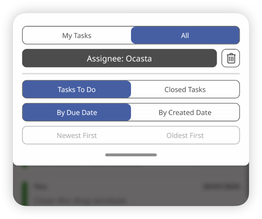 - Assigned to — See tasks for a particular region, location, or team member (you’ll only see the places and people you’ve got permission to view)